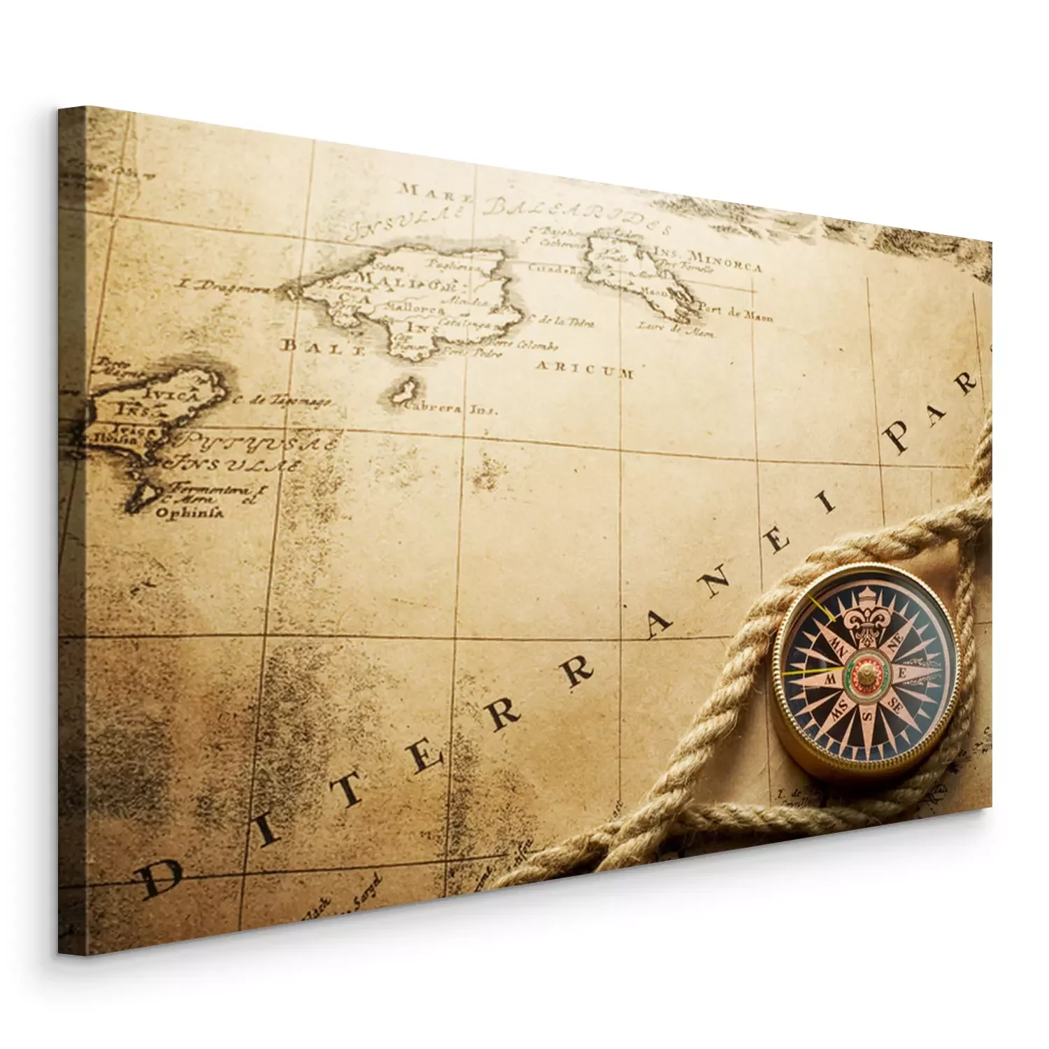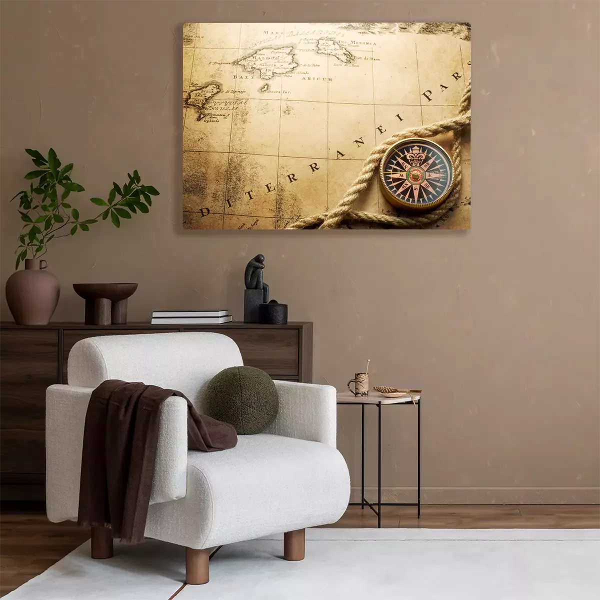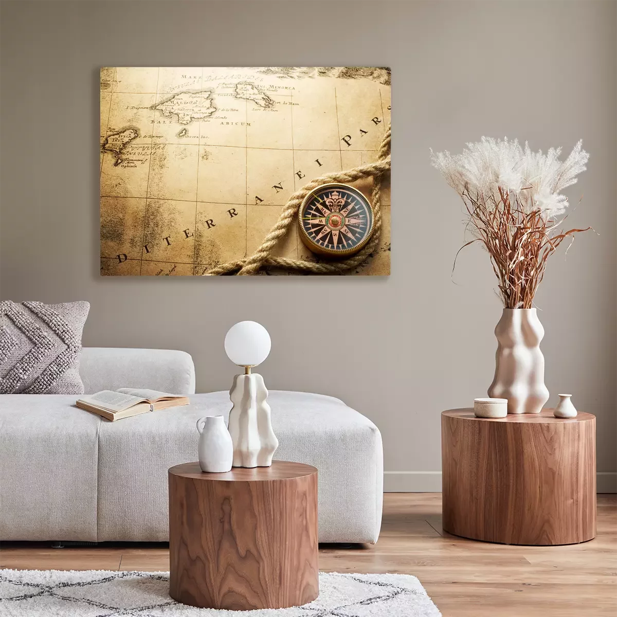 Oud kompas, verrekijker en touwen op een vintage wereldkaart