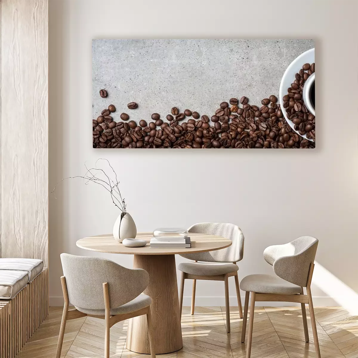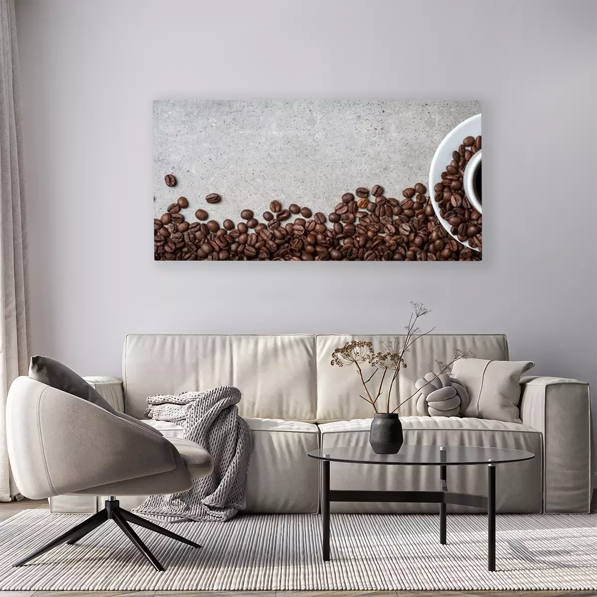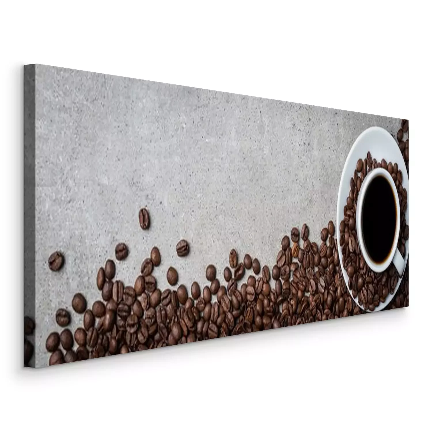 Canvas: Kopje koffie met koffiebonen op de grijze steen achtergrond. bovenaanzicht
