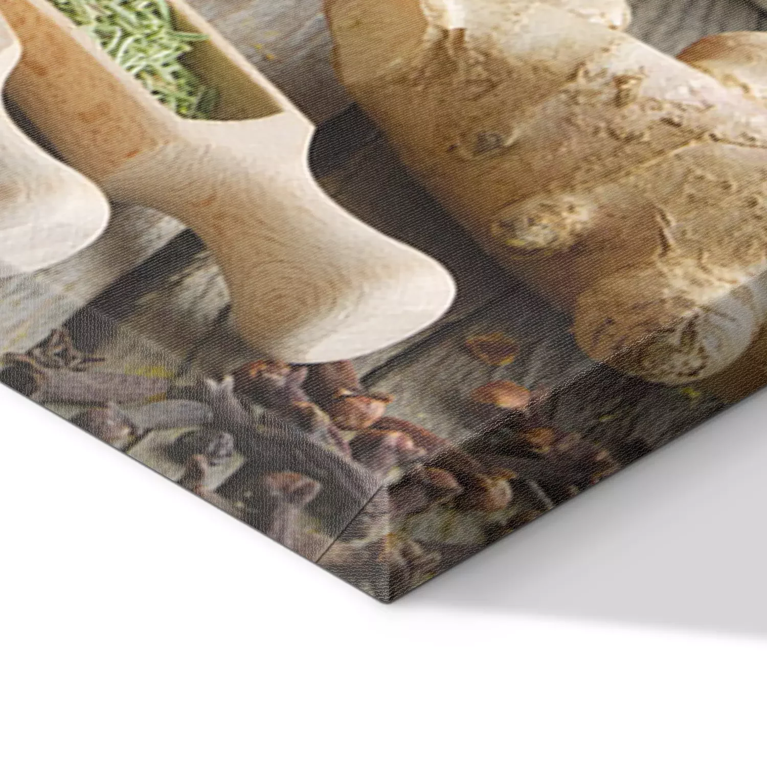 De print wordt aangebracht op hoogwaardig canvas dat op een schildersweefgetouw (spieraam) wordt gespannen. Omdat de print de zijranden bedekt, hoeft het ontwerp niet met een extra kader te worden omlijst. Wij raden ook composities aan die uit meerdere foto's bestaan en zo een coherente compositie vormen.