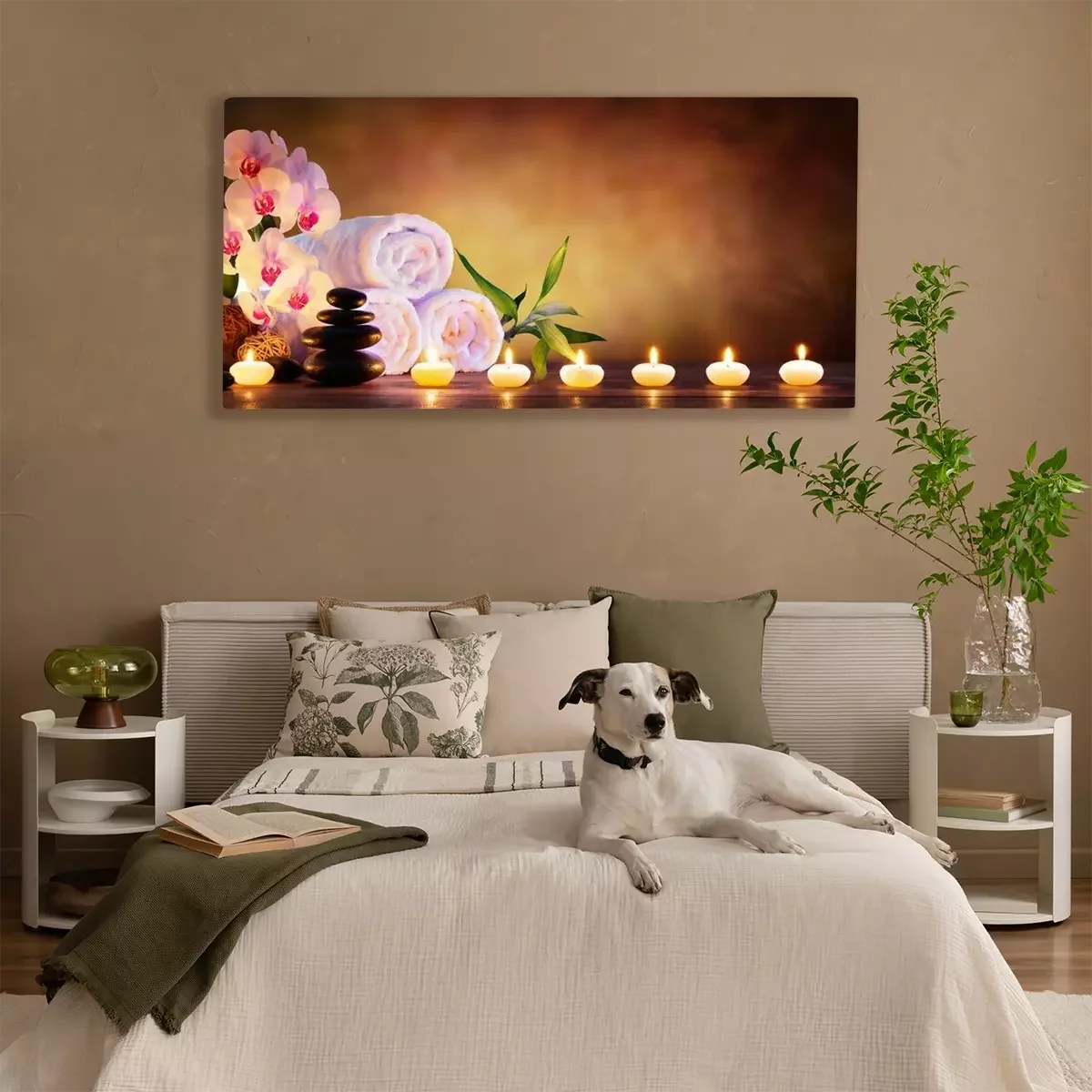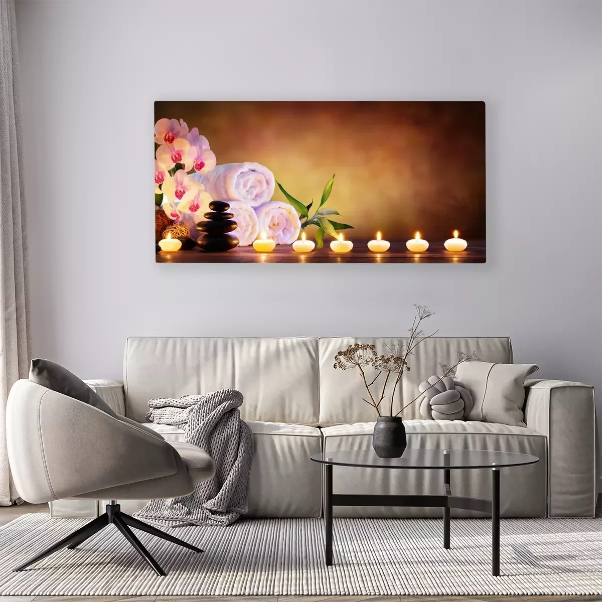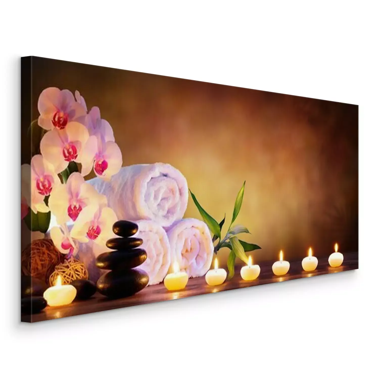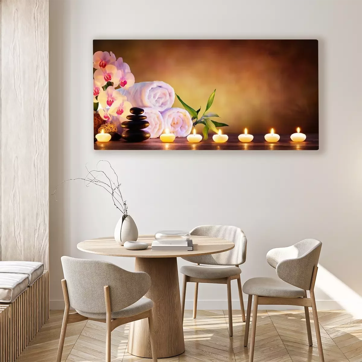 Canvas: Kuuroordconcept - Massagestenen met Handdoeken en Kaarsen op Natuurlijke Achtergrond
