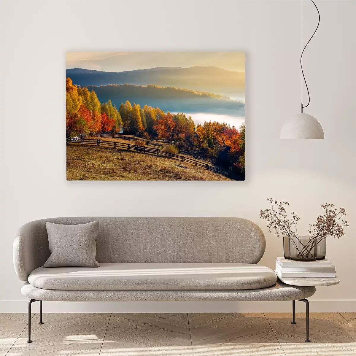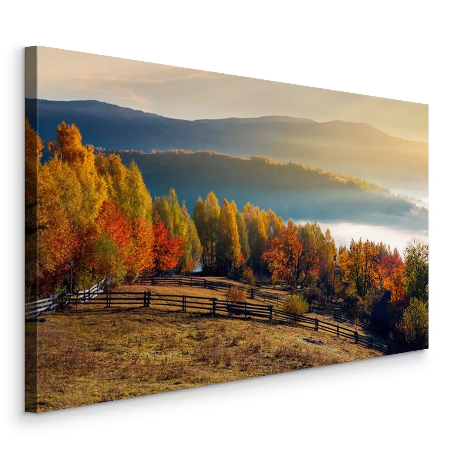 Canvas: landelijk gebied en boomgaard in de herfst bij zonsopgang. bergachtig landschap met mist in verre wally