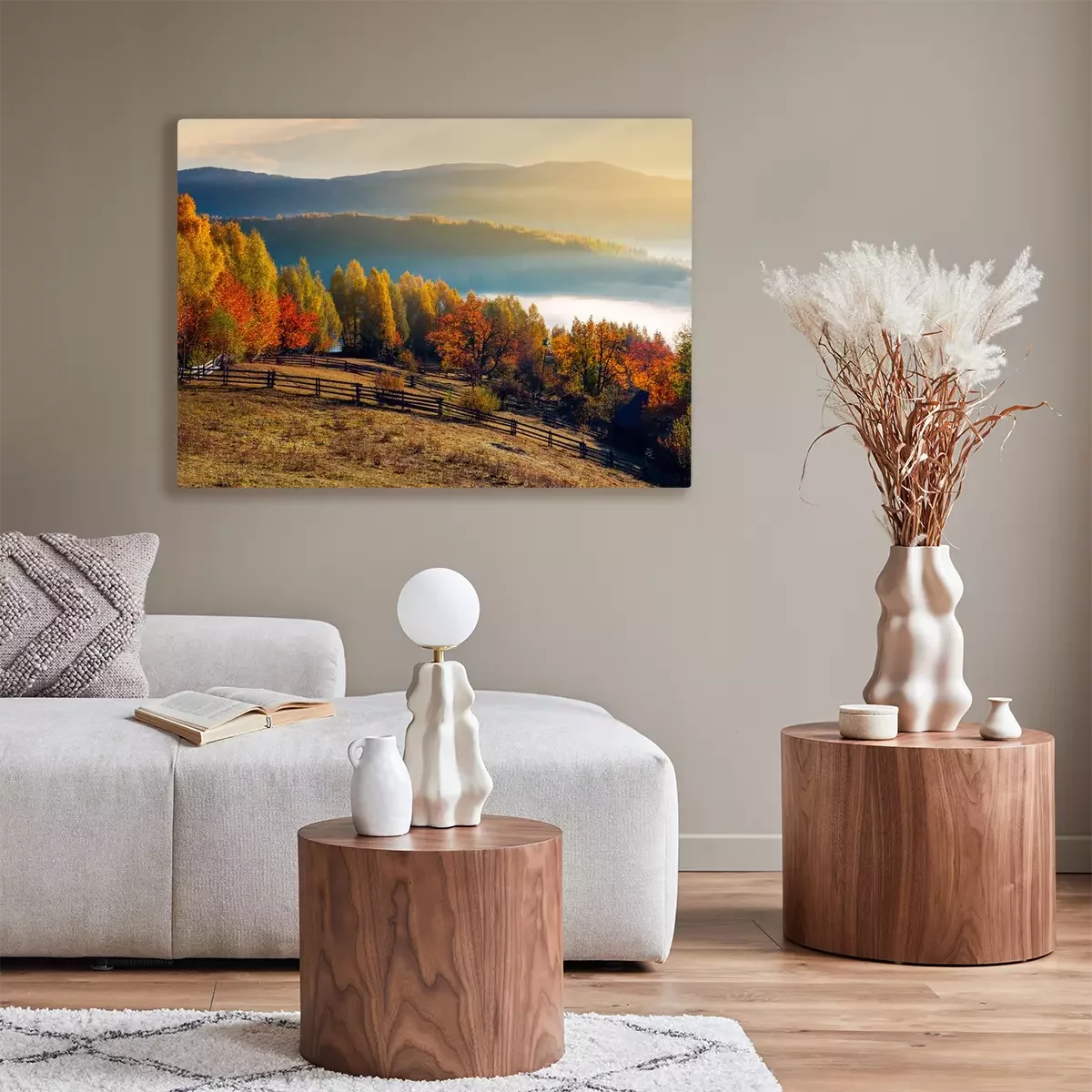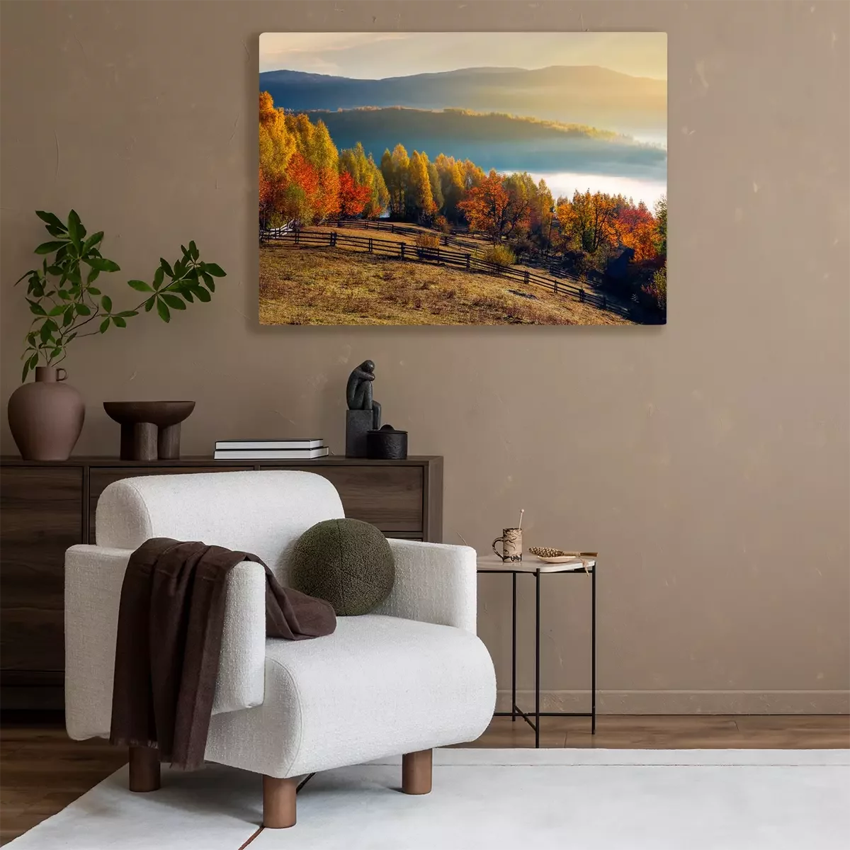 Canvas landelijk gebied en boomgaard in de herfst bij zonsopgang. bergachtig landschap met mist in verre wally