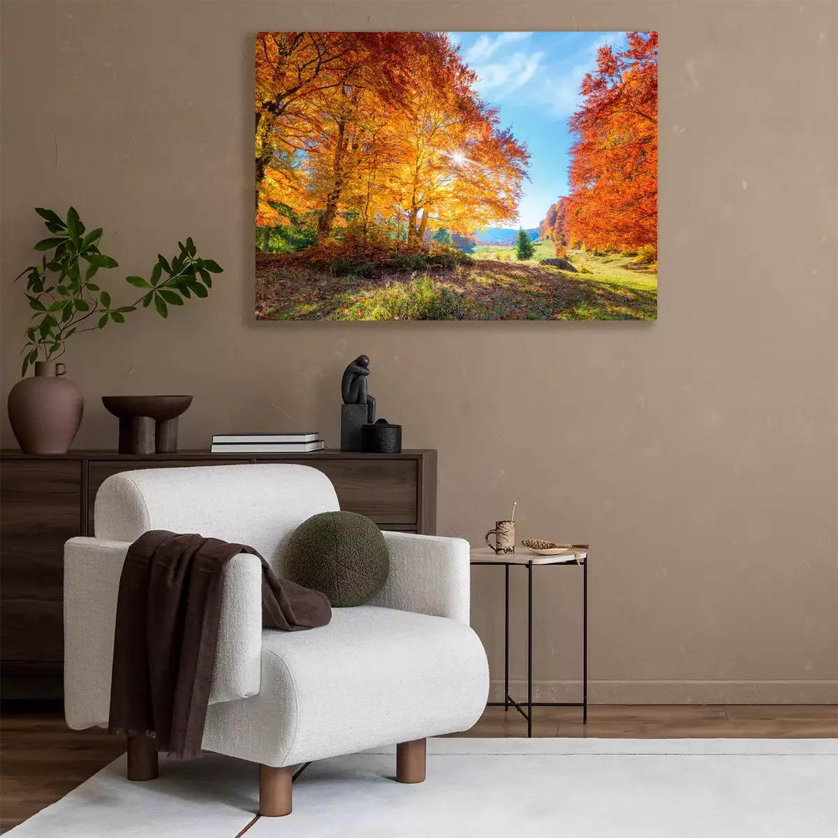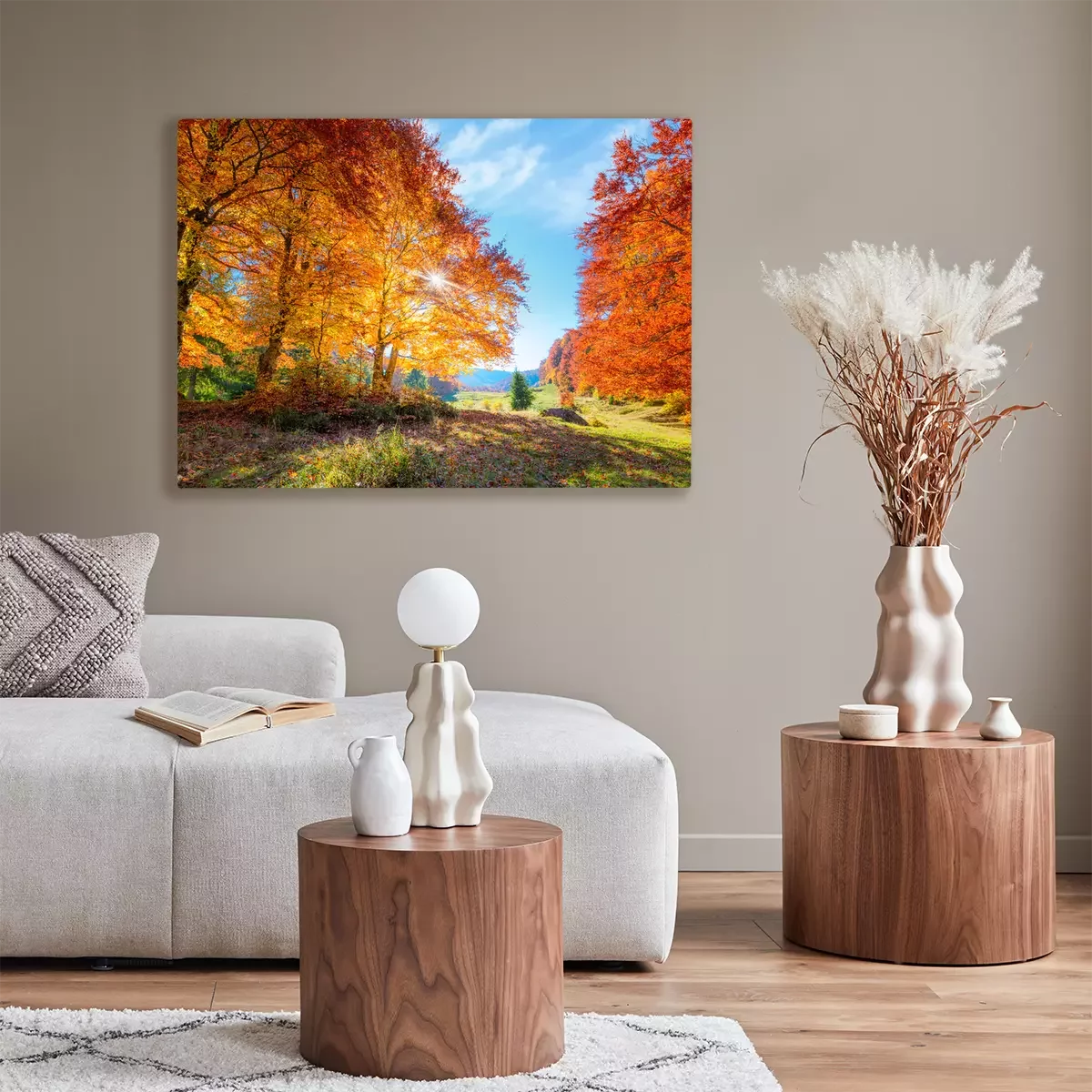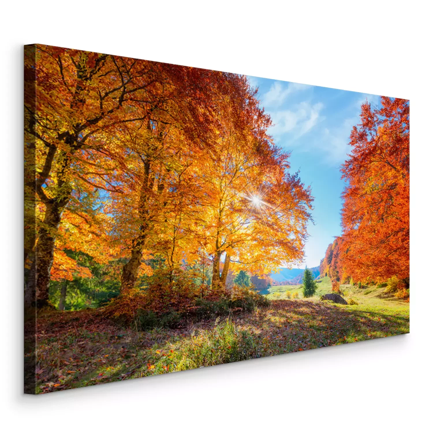 Canvas: Landscape of Autumnal forest with real sun and orange trees on meadow