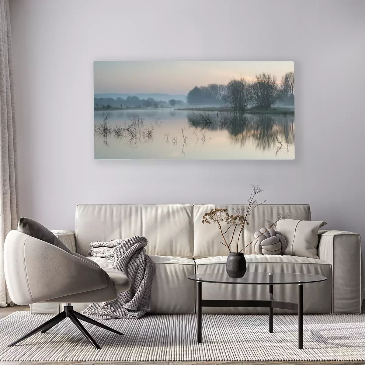 Canvas: Landscape of lake in mist with sun glow at sunrise