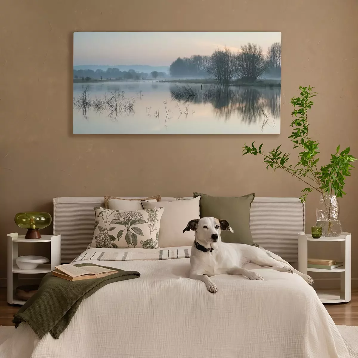 Canvas Landscape of lake in mist with sun glow at sunrise