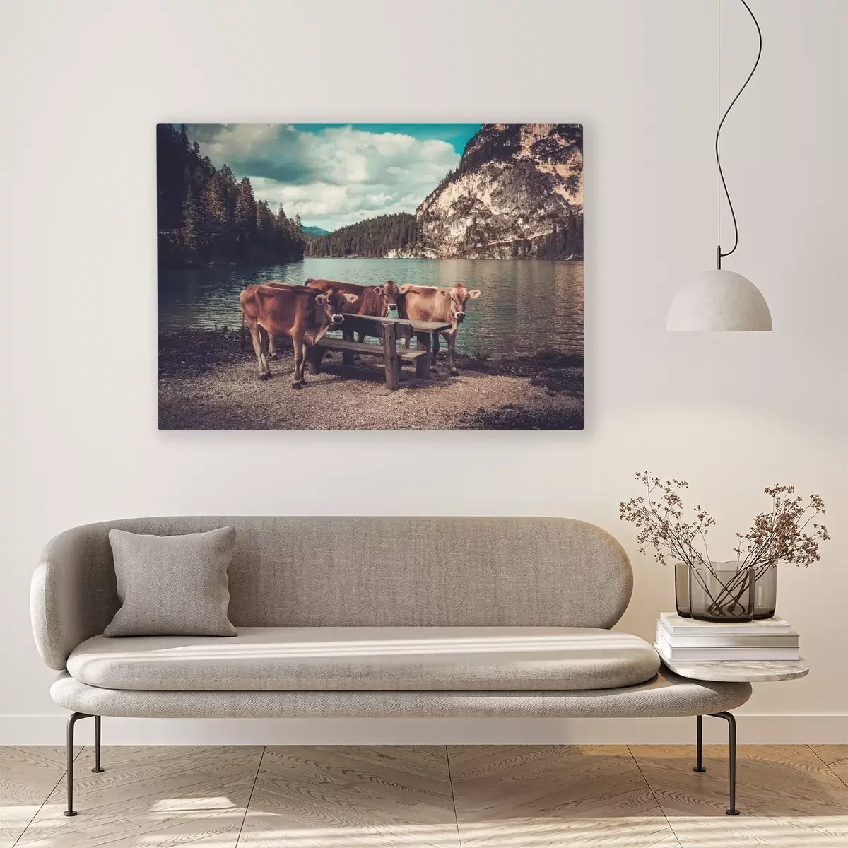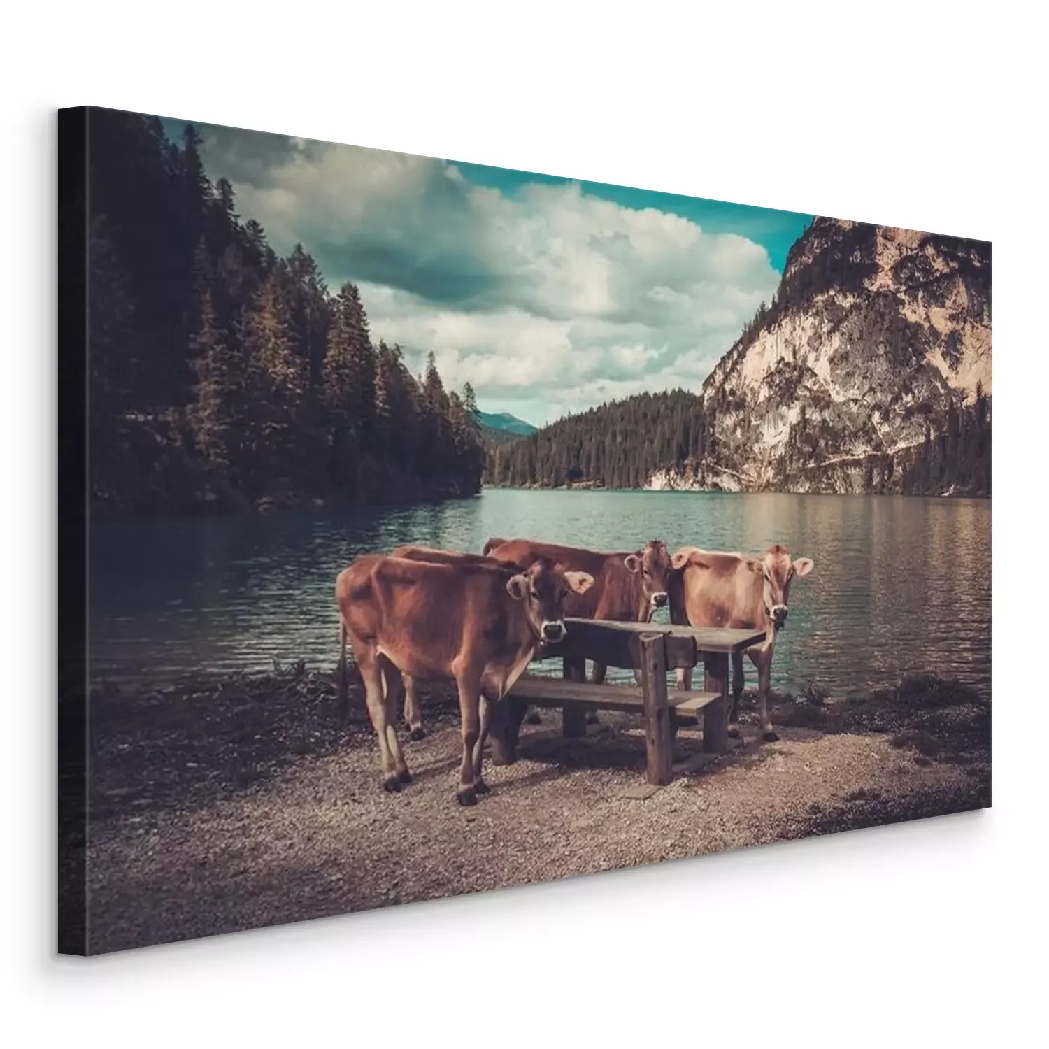 Canvas: Landschap met koeien tegen de achtergrond van een bergmeer