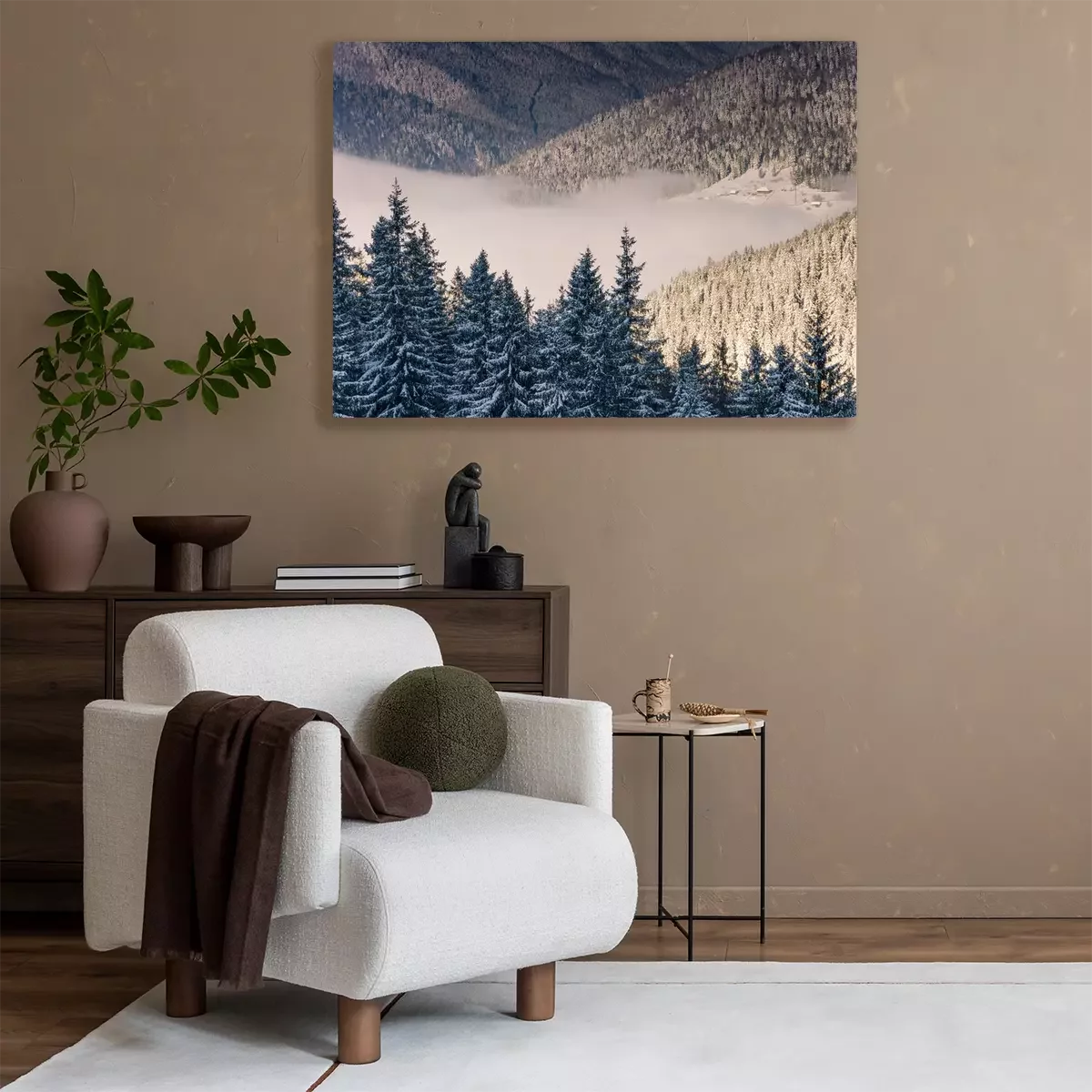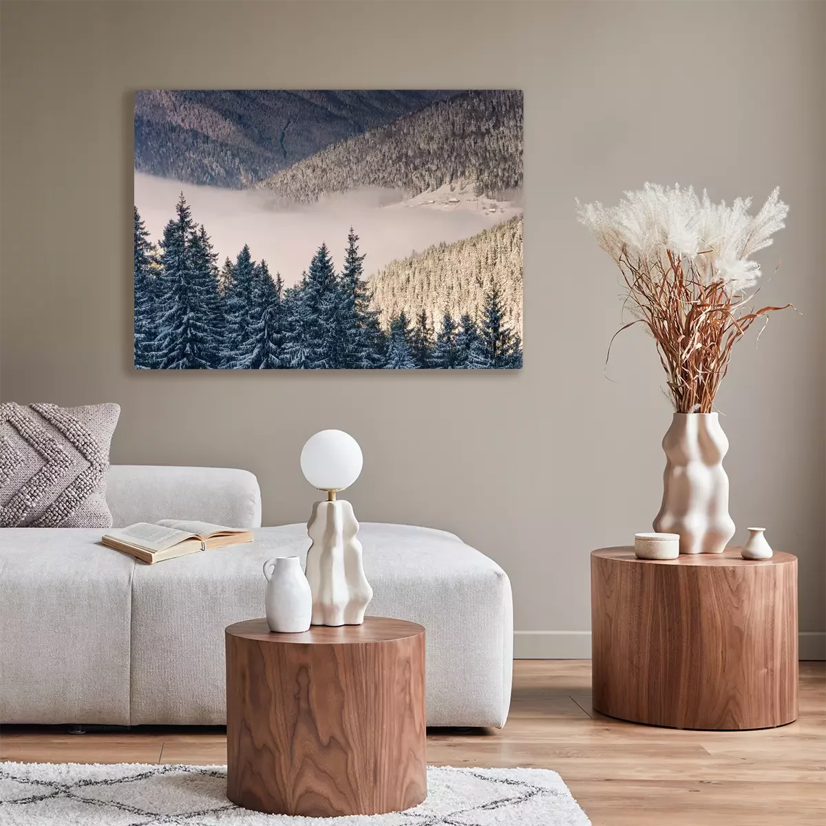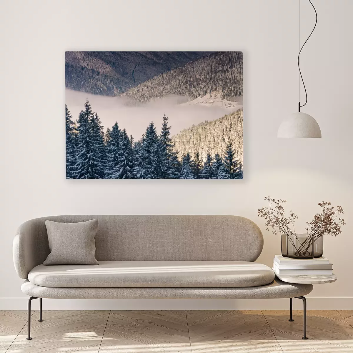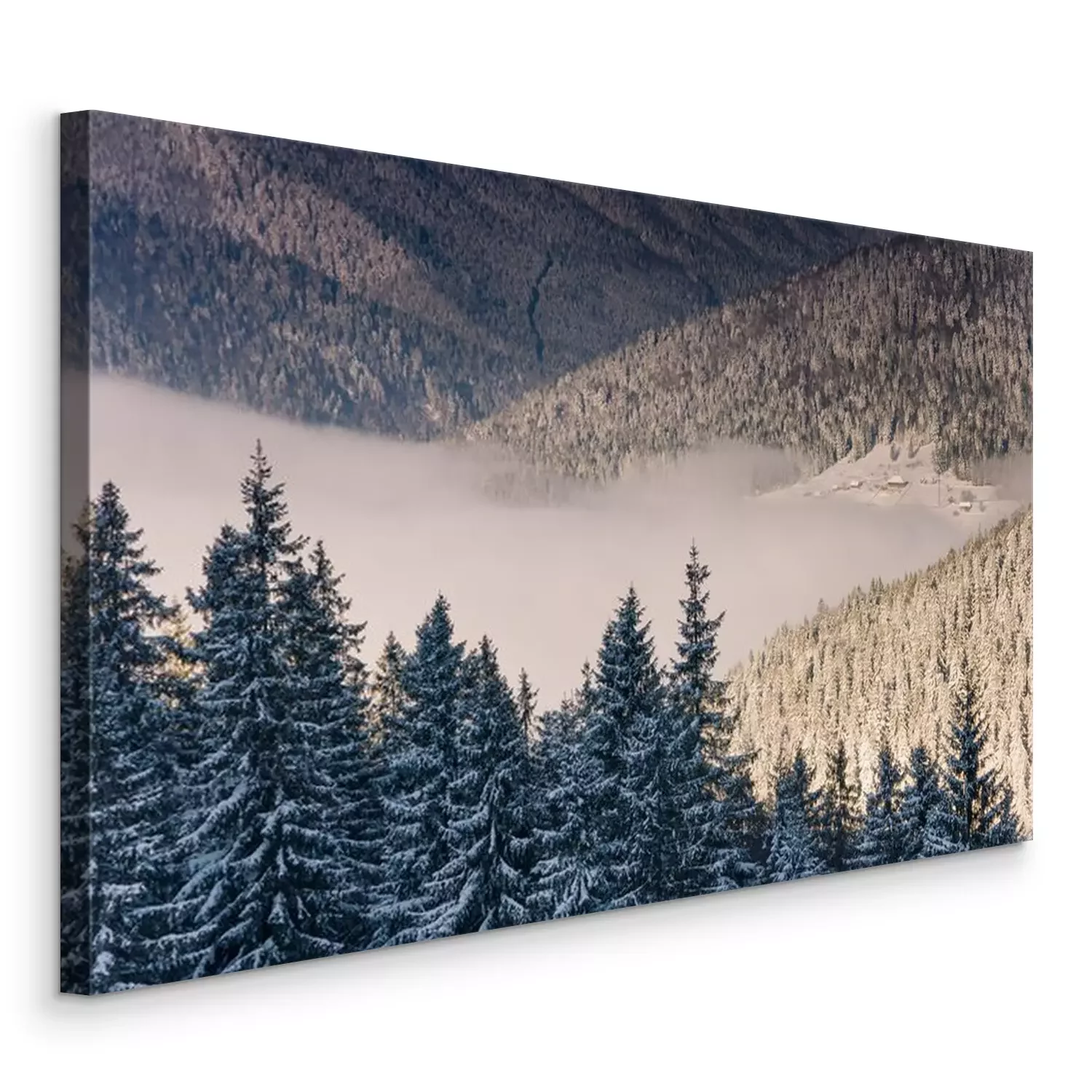 Canvas Landschap van de winter bergen. Uitzicht op besneeuwde naaldbomen in mist bij zonsopgang en vilage afstand