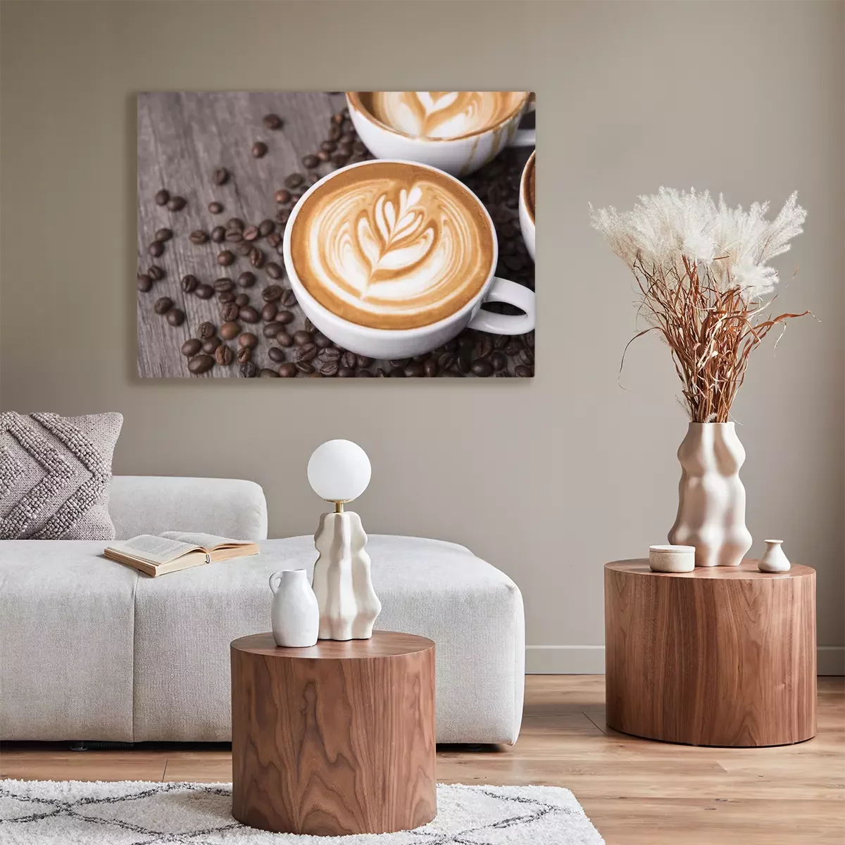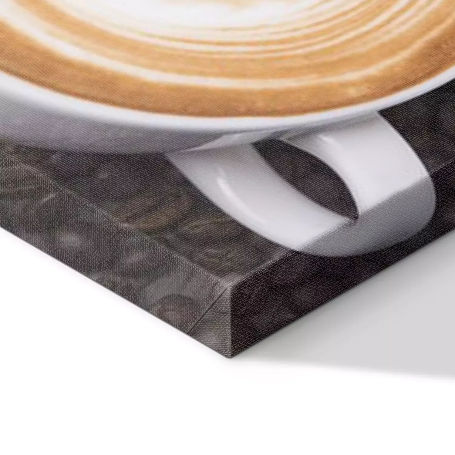 Canvas: latte of cappuccino met schuimige schuim, koffiekopje bovenaanzicht op tafel in café.