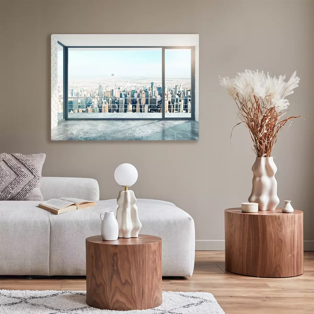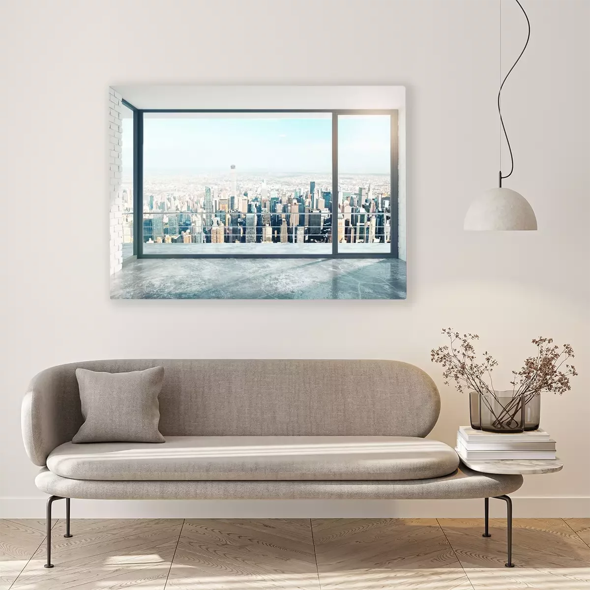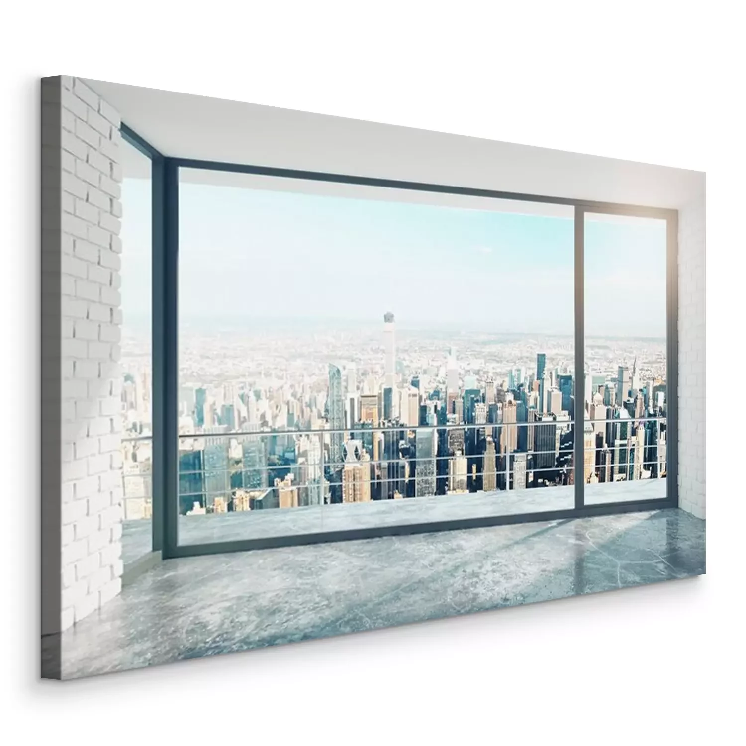 Canvas: Lege zolderkamer met groot raam in de vloer en uitzicht op de stad