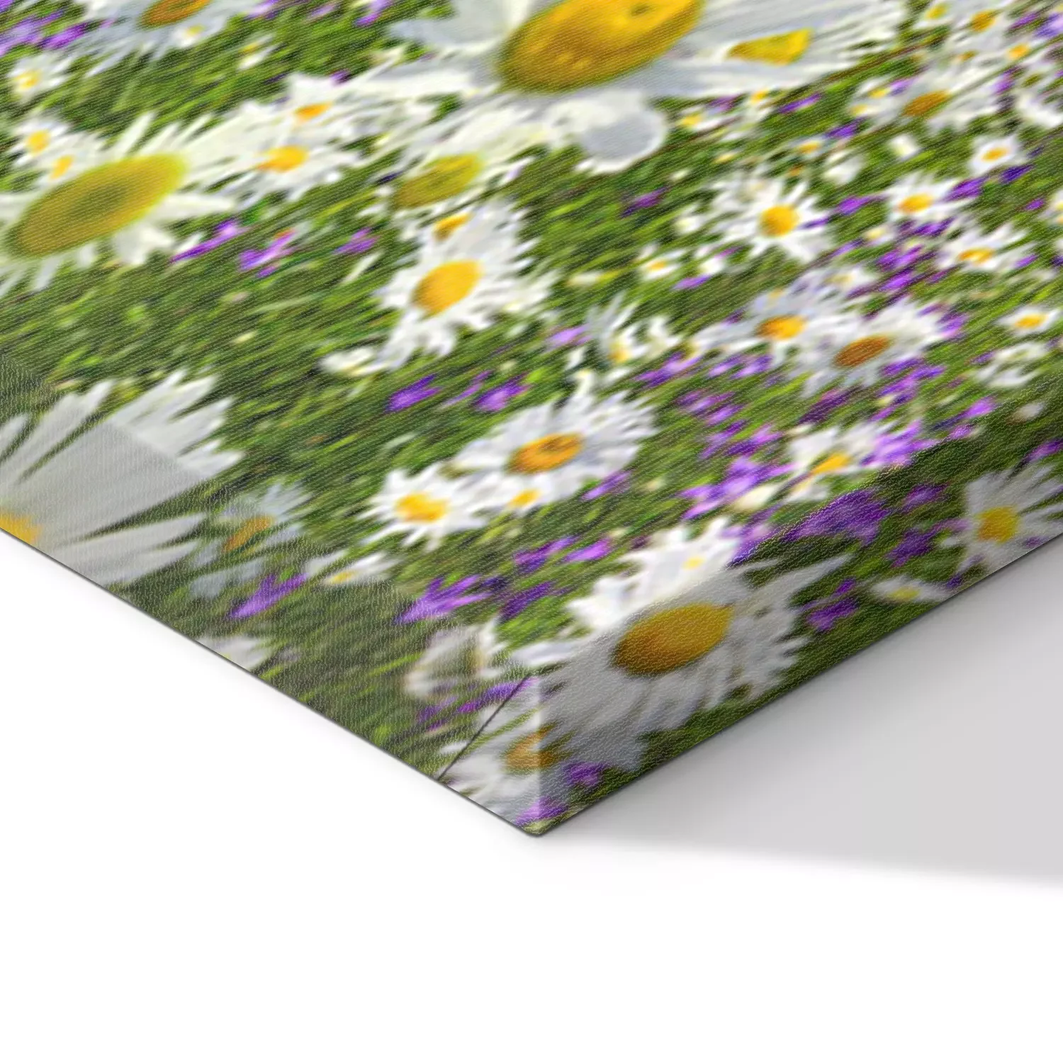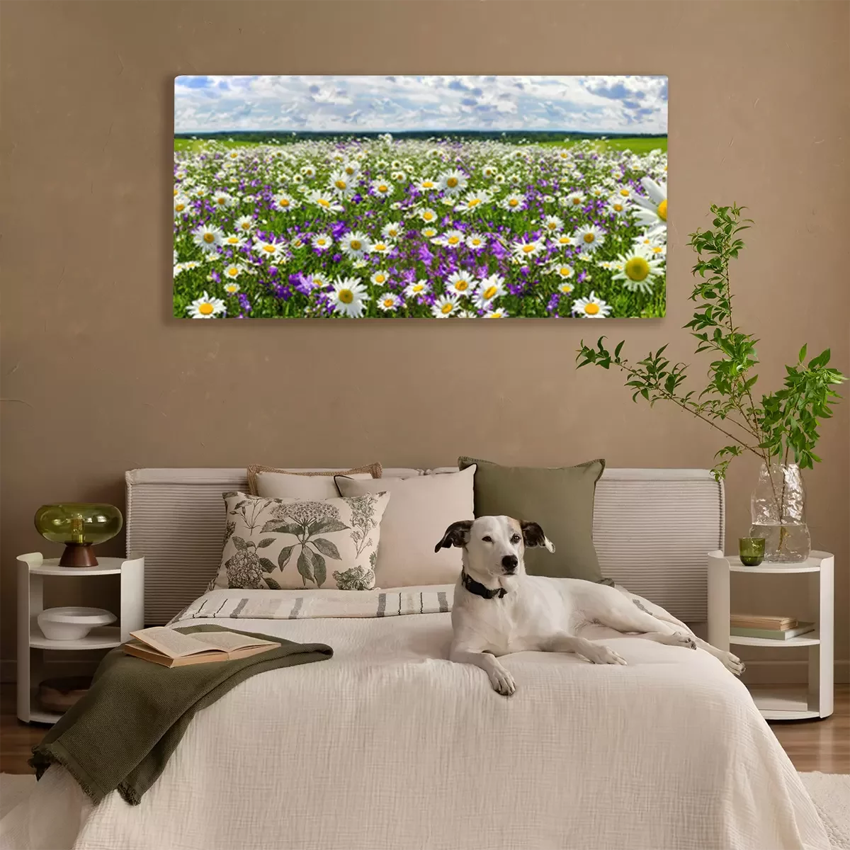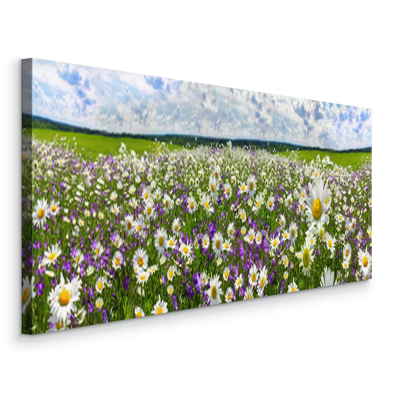 Canvas: lente landschap panorama met bloeiende bloemen op weide