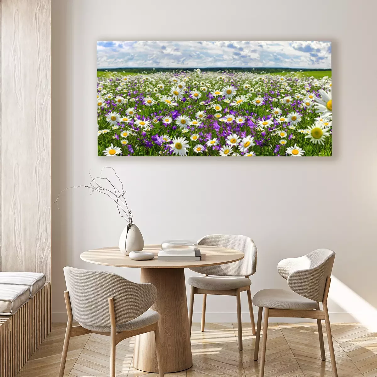 Canvas lente landschap panorama met bloeiende bloemen op weide