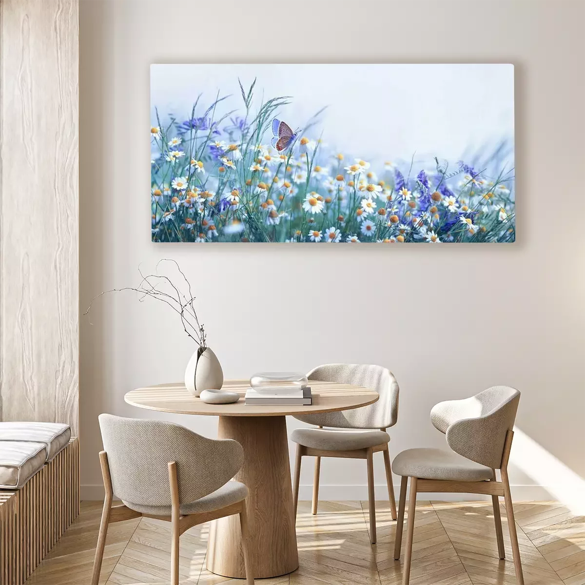 Beautiful field meadow flowers chamomile and violet wild bells and three flying butterflies in morning green grass in sunlight, natural landscape. Delightful pastoral airy fresh artistic image nature.