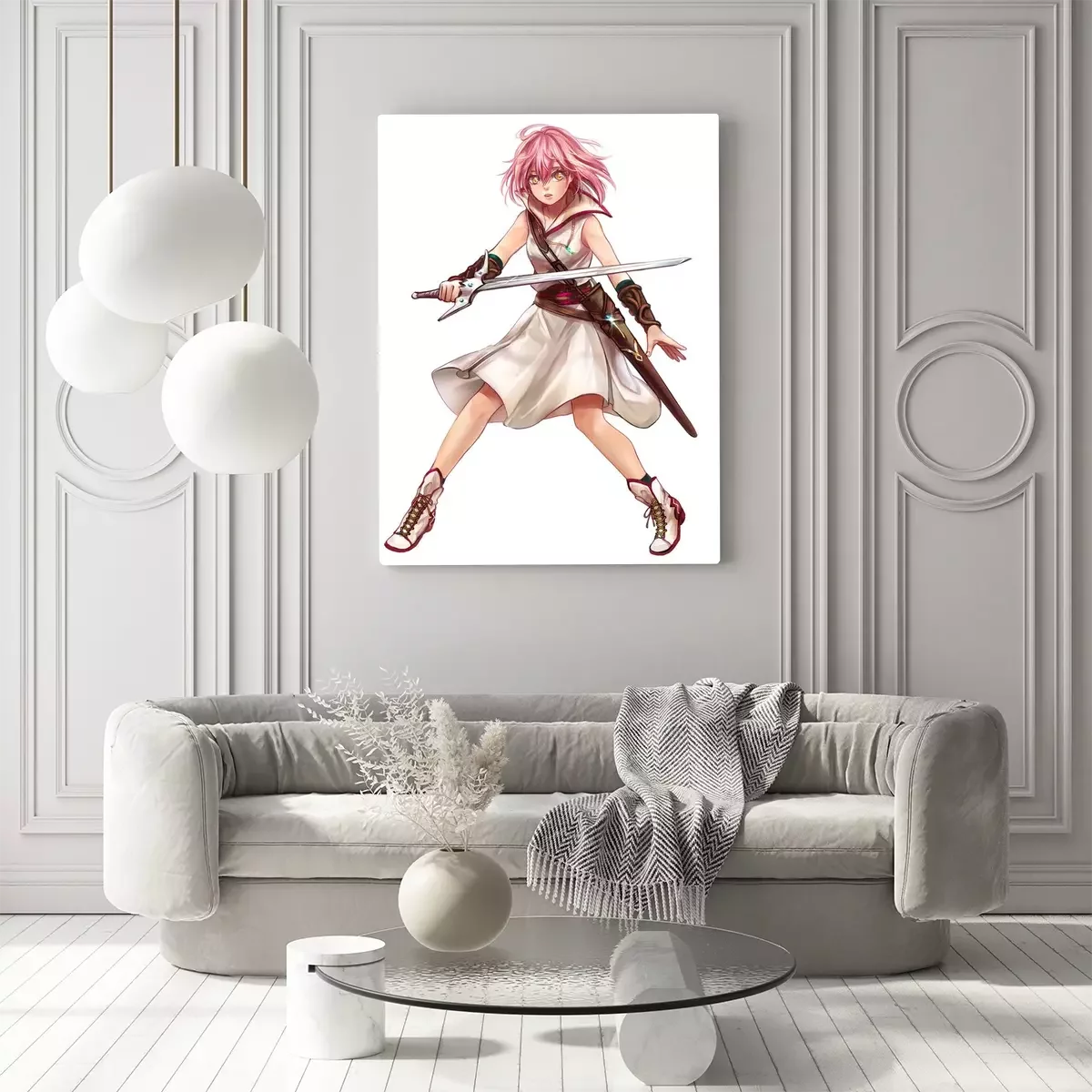 Canvas: Leuk origineel karakterontwerp van strijder van het fantasie de vrouwelijke meisje of swordswoman magische schermerkrijger genoemd Lenaria in Japanse manga-illustratiestijl met geïsoleerde witte achte