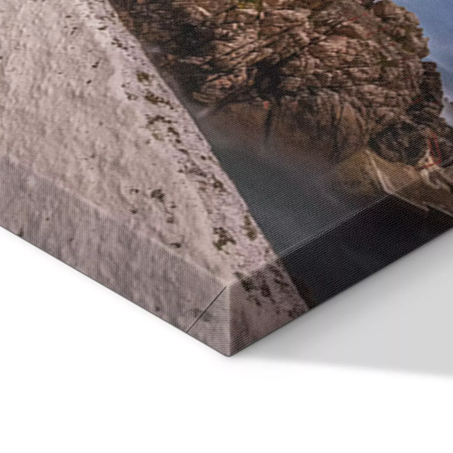 De print wordt aangebracht op hoogwaardig canvas dat op een schildersweefgetouw (spieraam) wordt gespannen. Omdat de print de zijranden bedekt, hoeft het ontwerp niet met een extra kader te worden omlijst. Wij raden ook composities aan die uit meerdere foto's bestaan en zo een coherente compositie vormen.