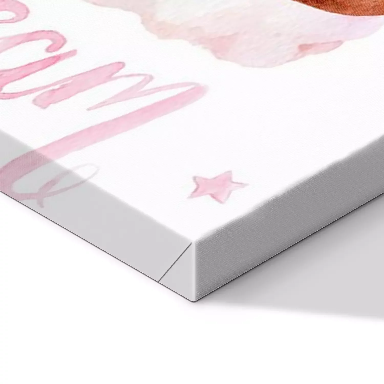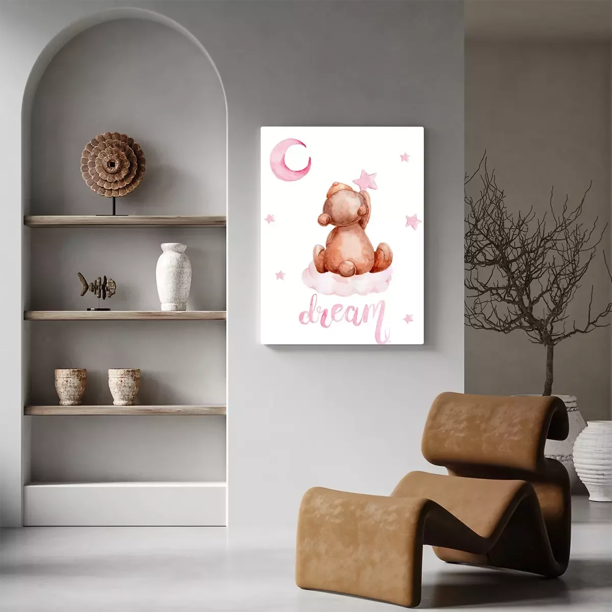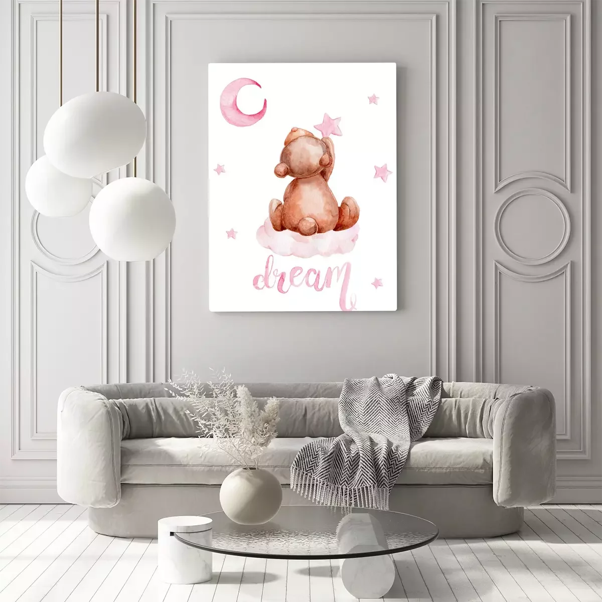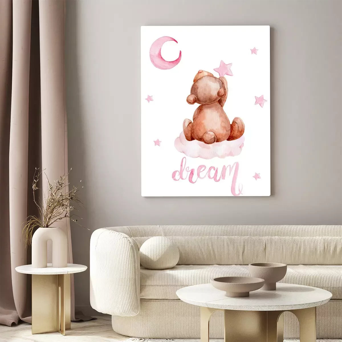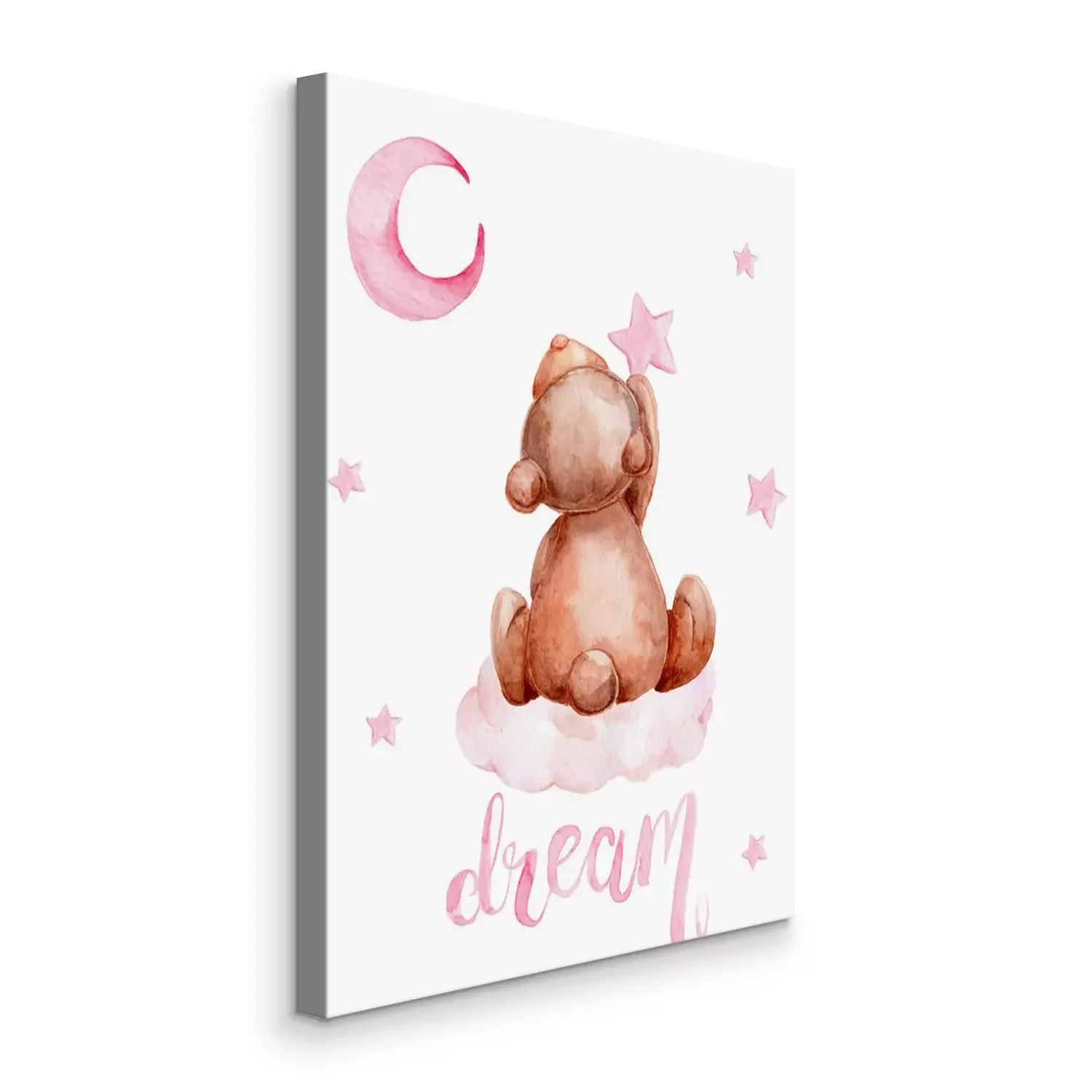 Canvas: Little brown teddy bear sitting on a cloud and moon and stars; watercolor hand draw illustration; with white isolated background