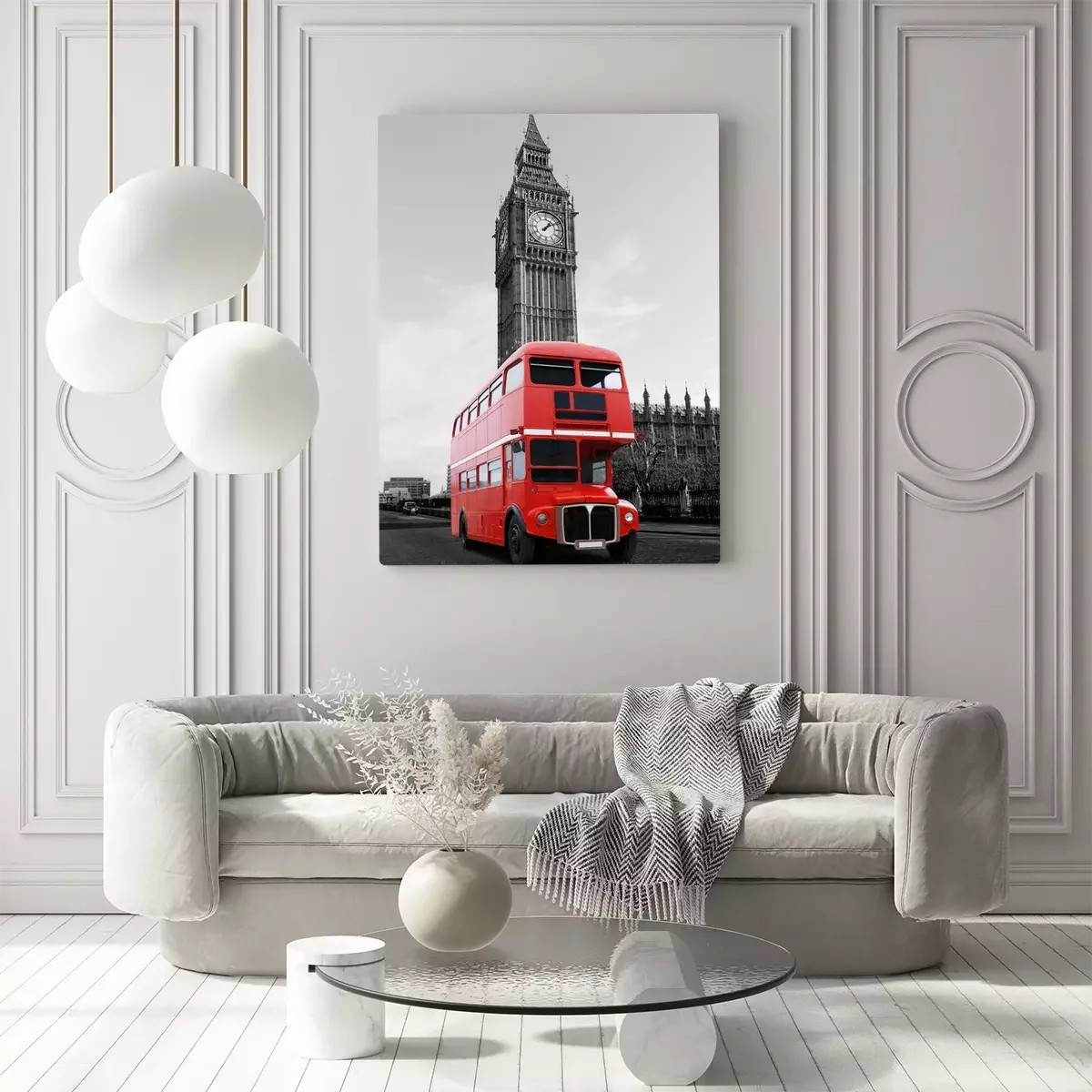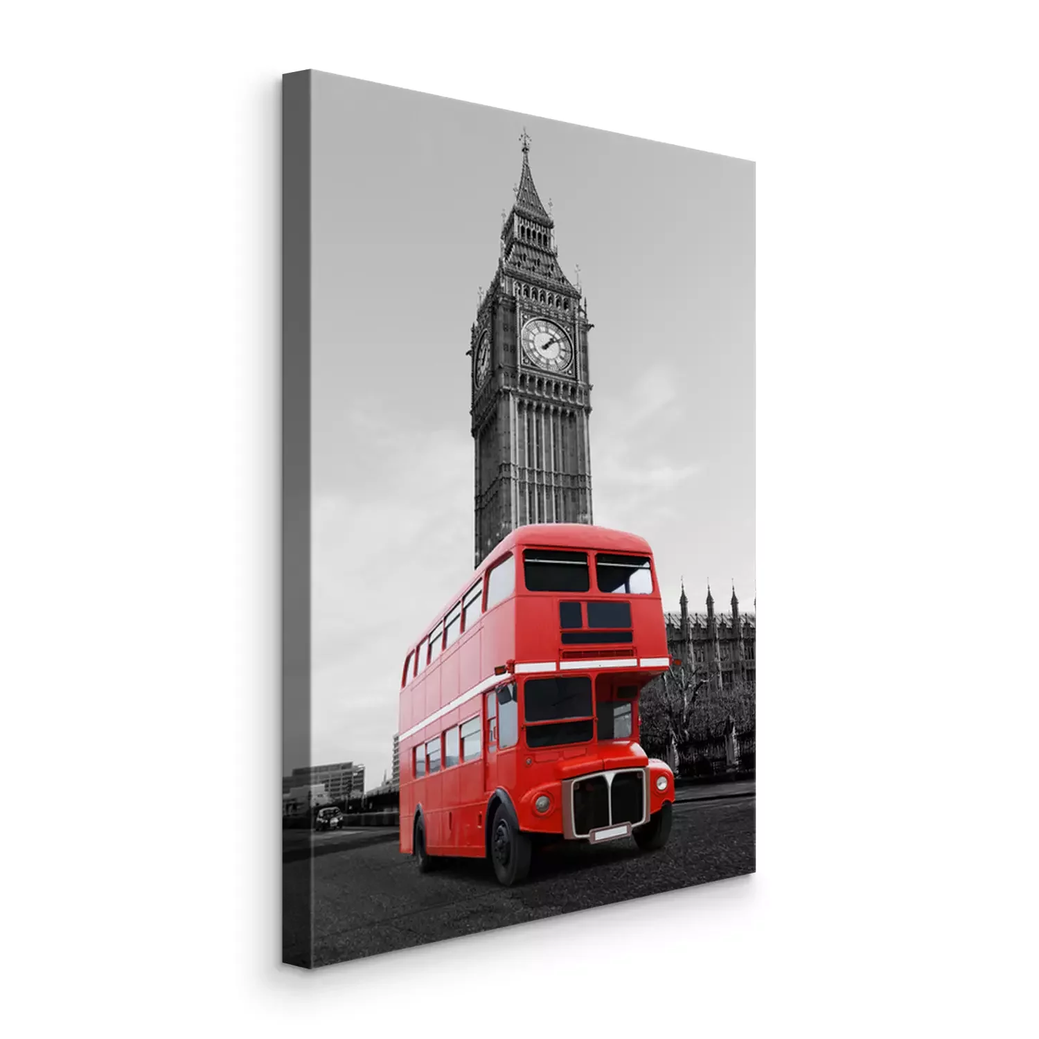 Big Ben in Londen mit roter Telefonzelle und Bus