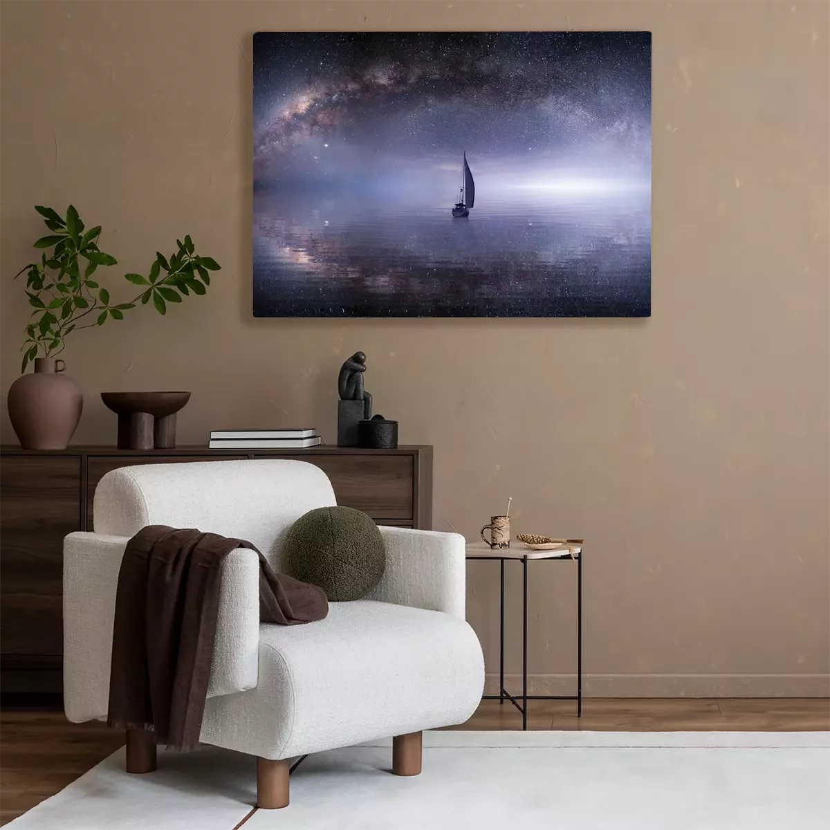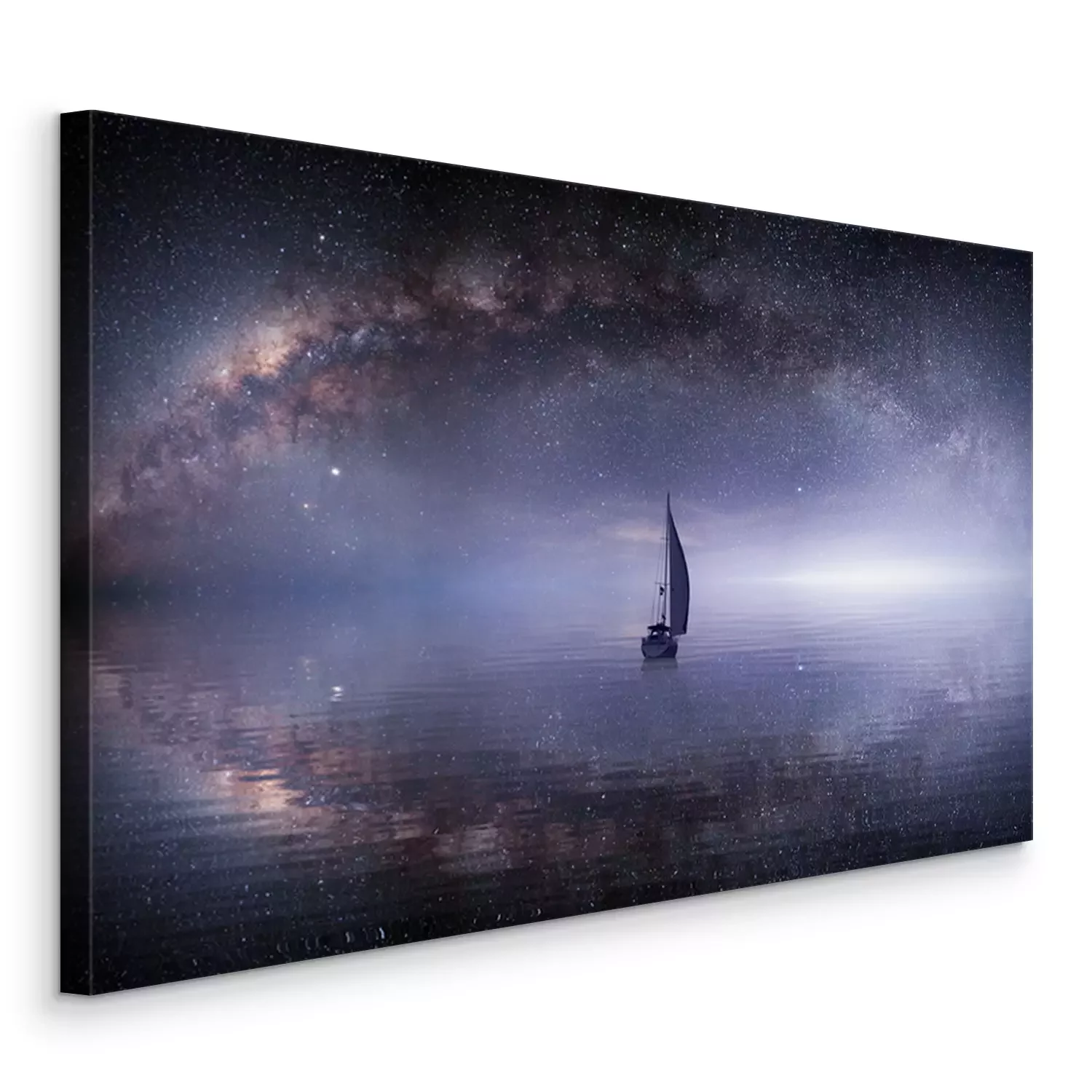 Canvas: lone sailing luxur yacht under starry night with milkyway galaxy