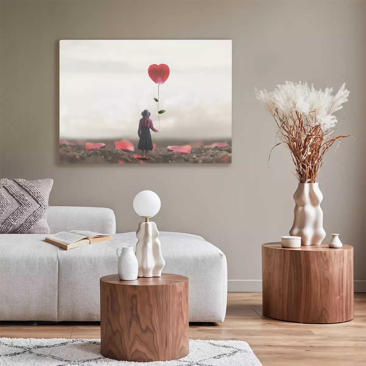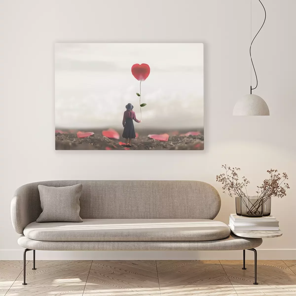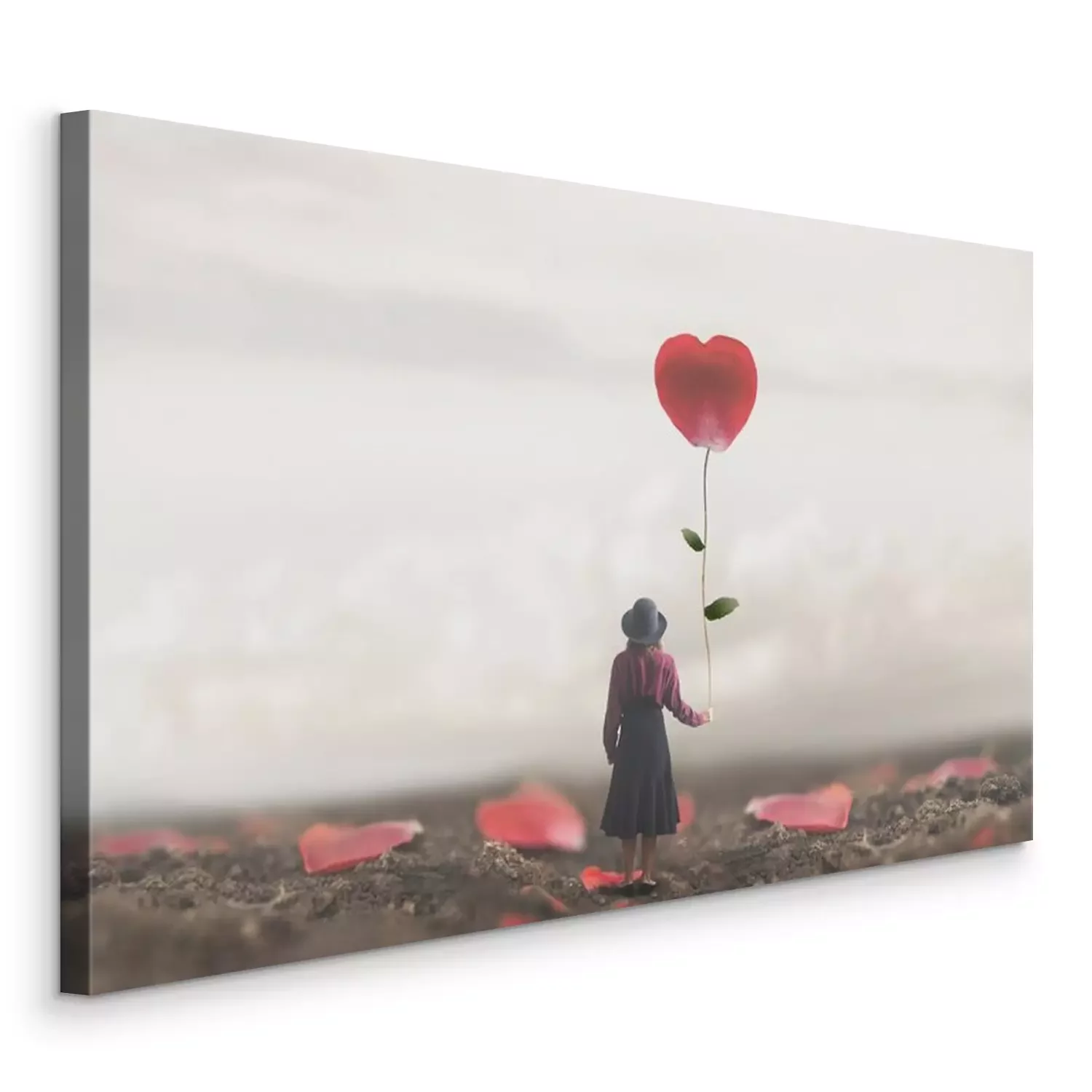 Canvas: lonely romantic woman holds a giant petal made to heart