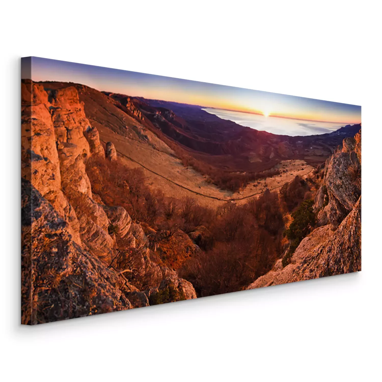Canvas luchtfoto van de berg heuvels en zonsopgang boven de zee