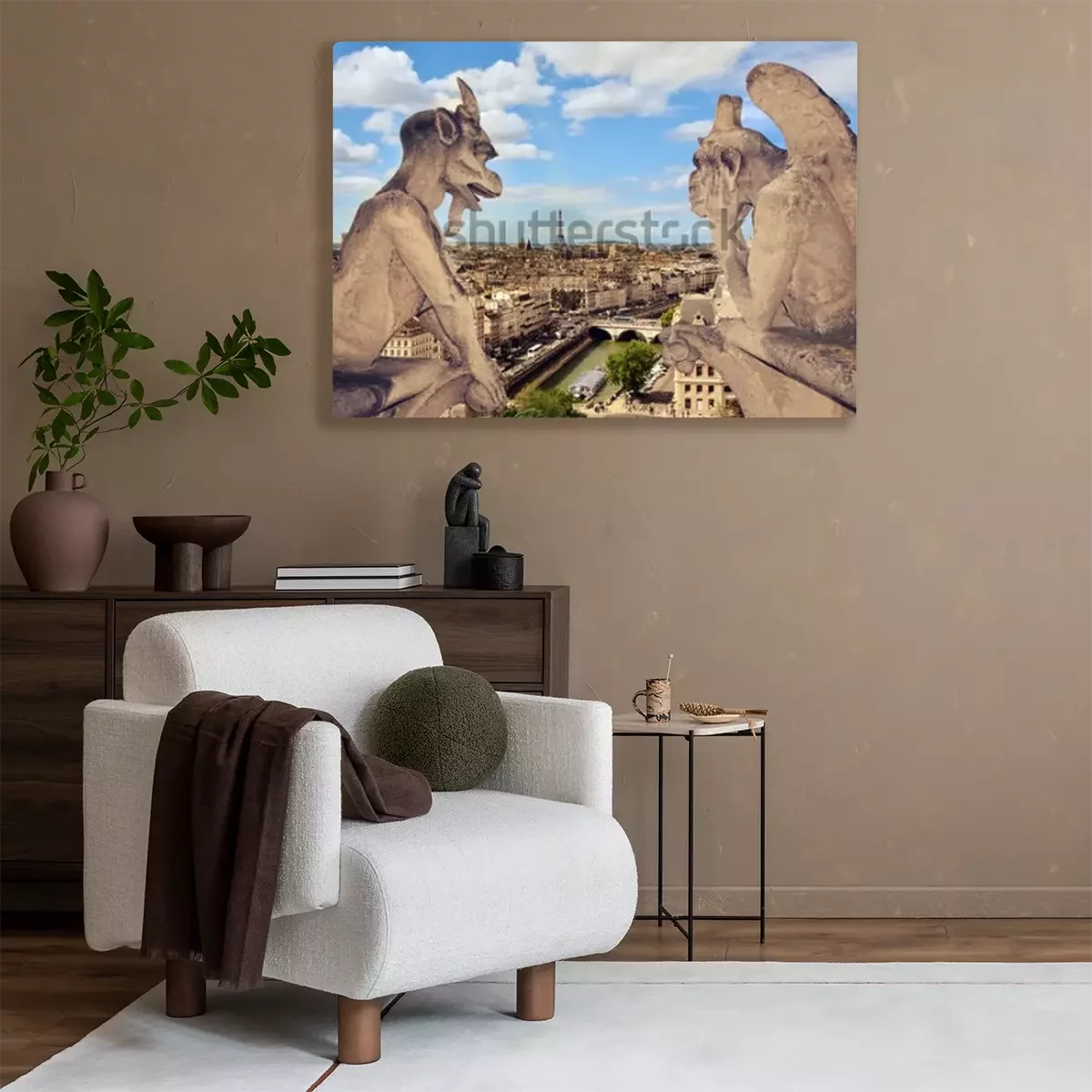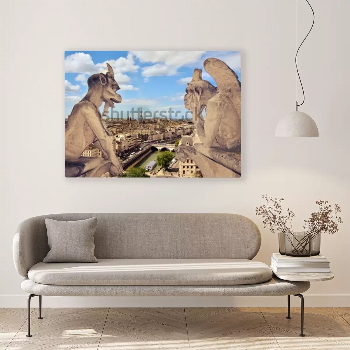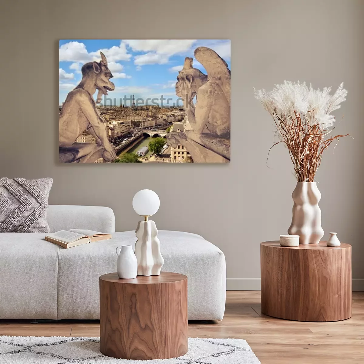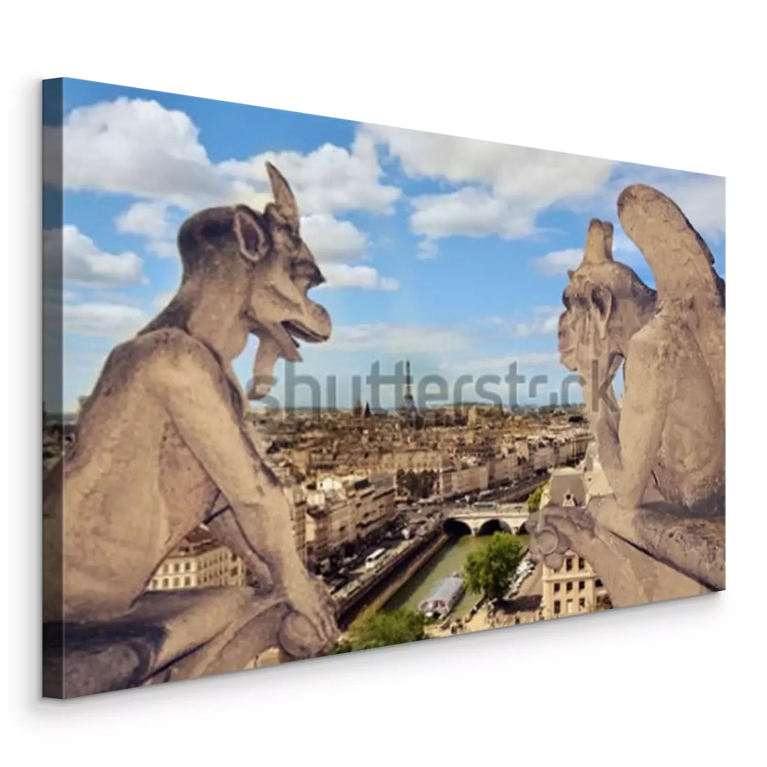 Canvas Luchtfoto van de stad Parijs, daken en de Eiffeltoren vanuit de galerij van Chimaera Notre Dame de Paris