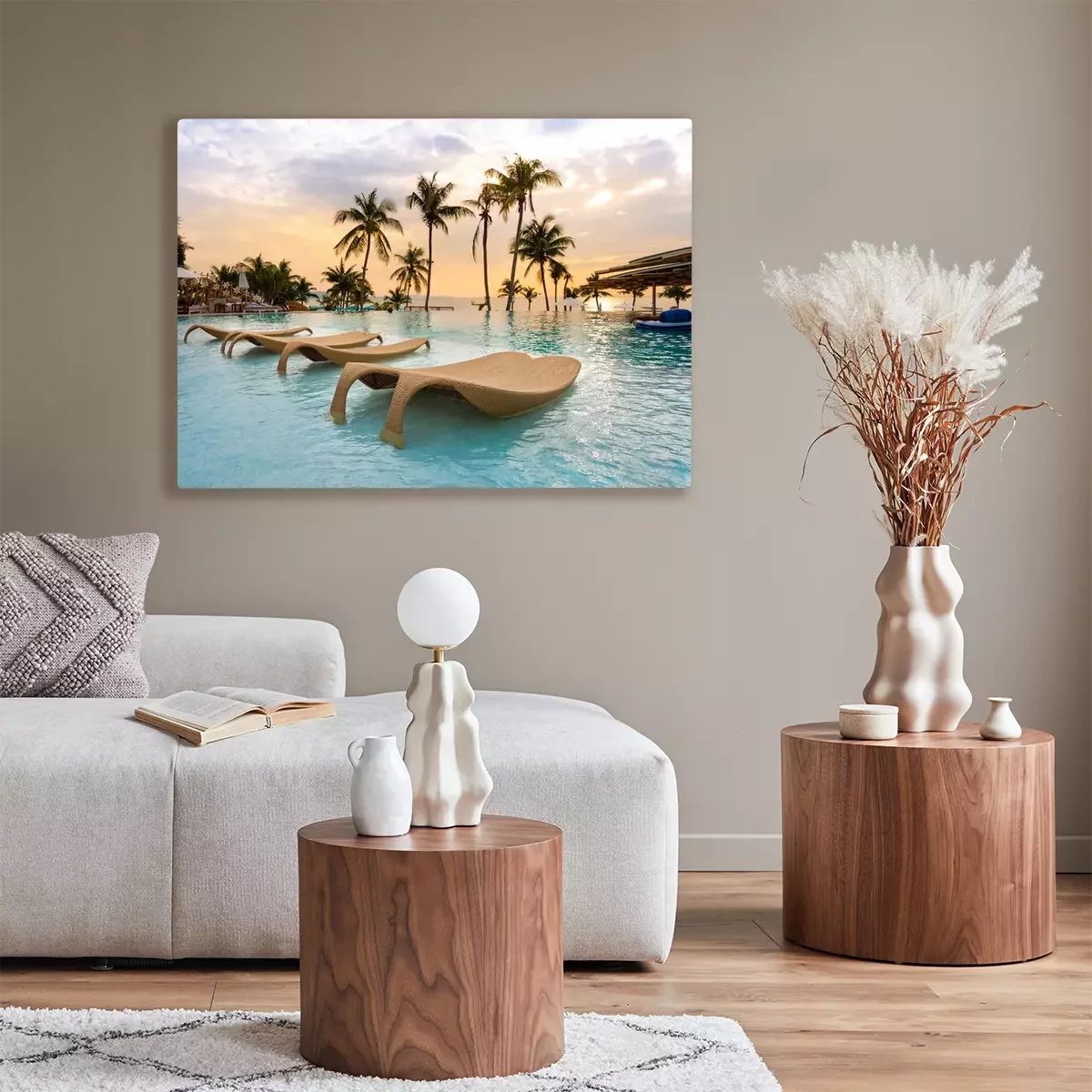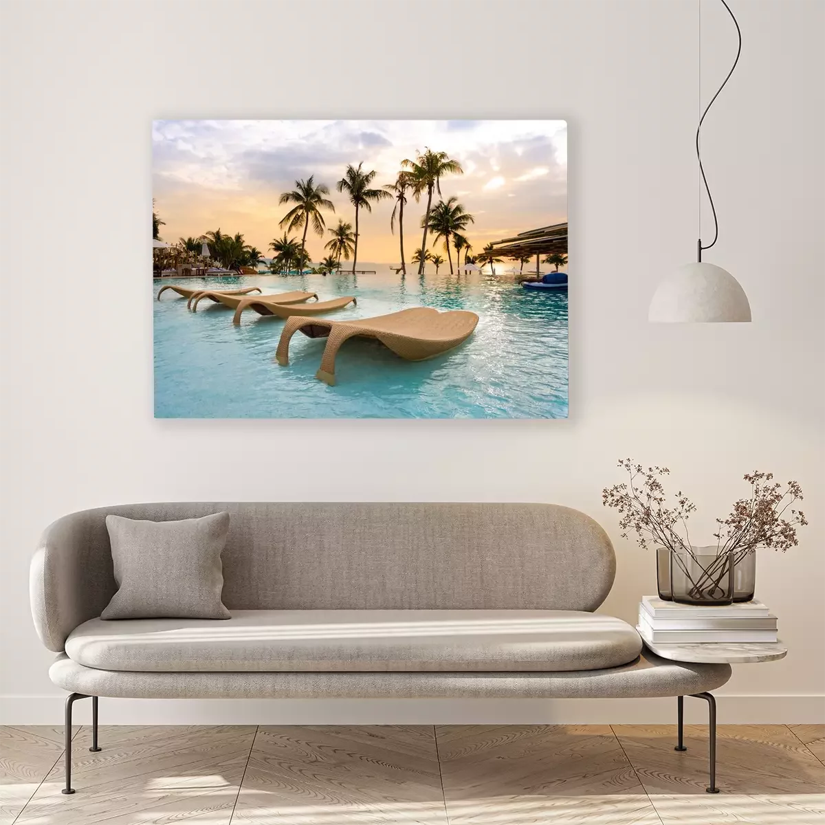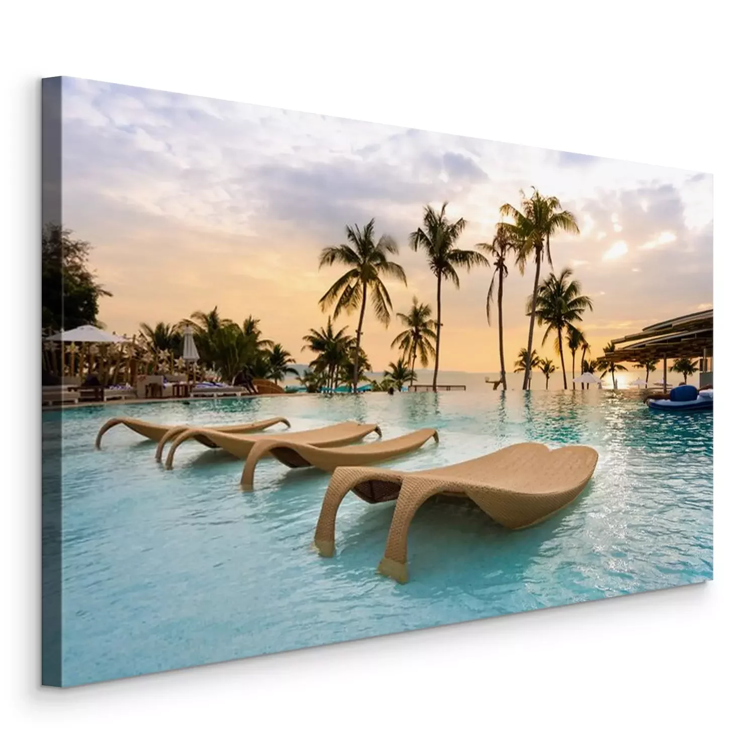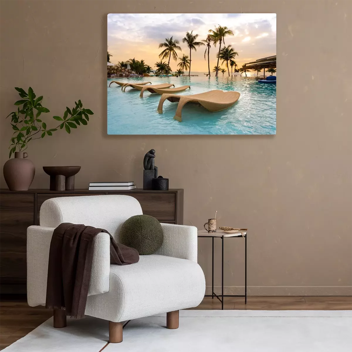 Canvas: luxury swimming pool on sea view and chair in hotel resort with sunrise time