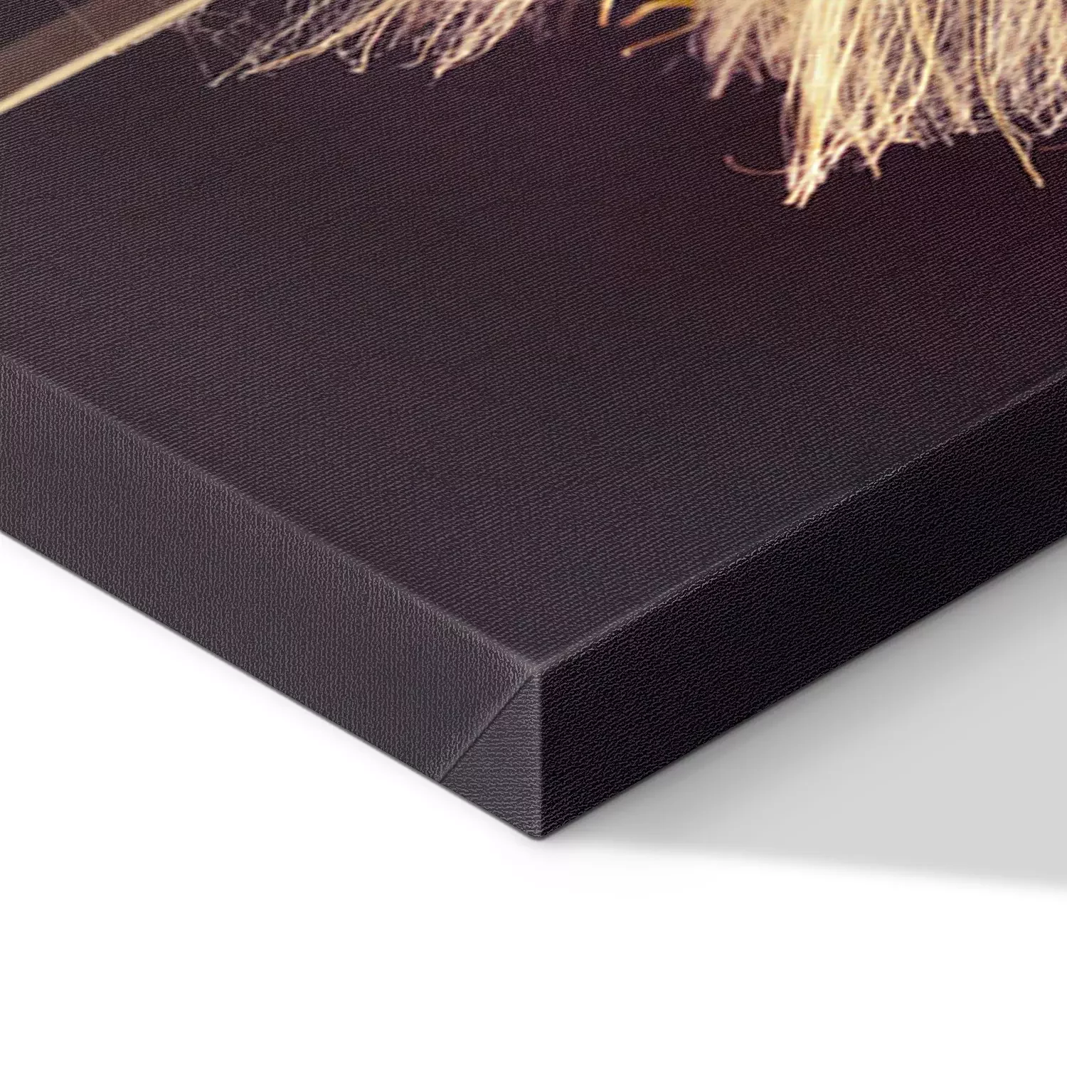 De print wordt aangebracht op hoogwaardig canvas dat op een schildersweefgetouw (spieraam) wordt gespannen. Omdat de print de zijranden bedekt, hoeft het ontwerp niet met een extra kader te worden omlijst. Wij raden ook composities aan die uit meerdere foto's bestaan en zo een coherente compositie vormen.