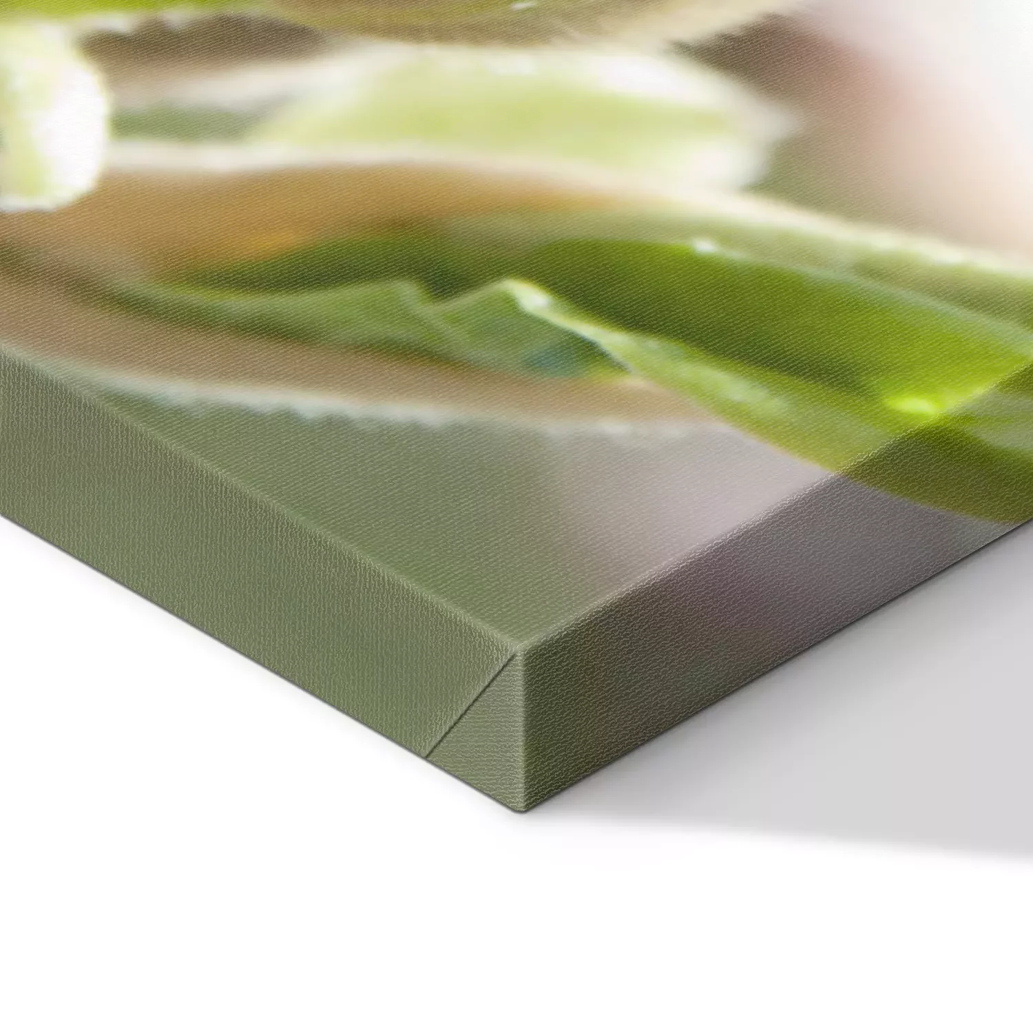De print wordt aangebracht op hoogwaardig canvas dat op een schildersweefgetouw (spieraam) wordt gespannen. Omdat de print de zijranden bedekt, hoeft het ontwerp niet met een extra kader te worden omlijst. Wij raden ook composities aan die uit meerdere foto's bestaan en zo een coherente compositie vormen.