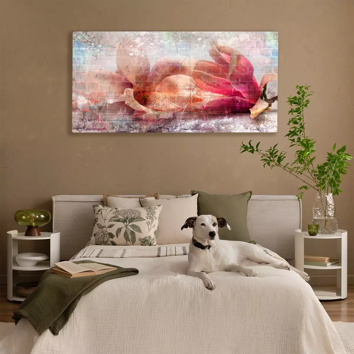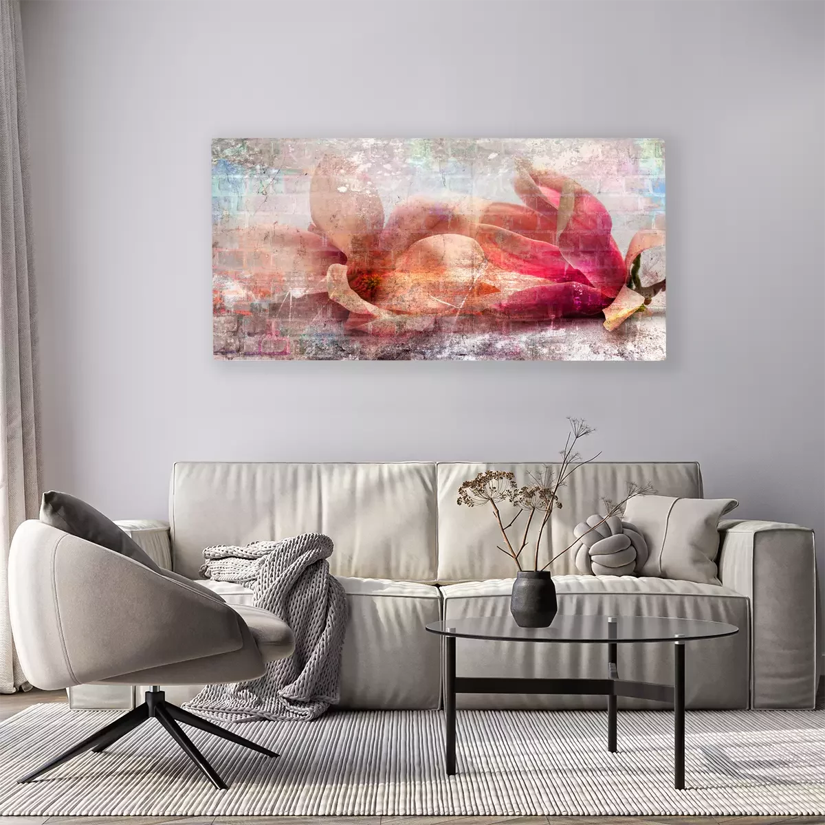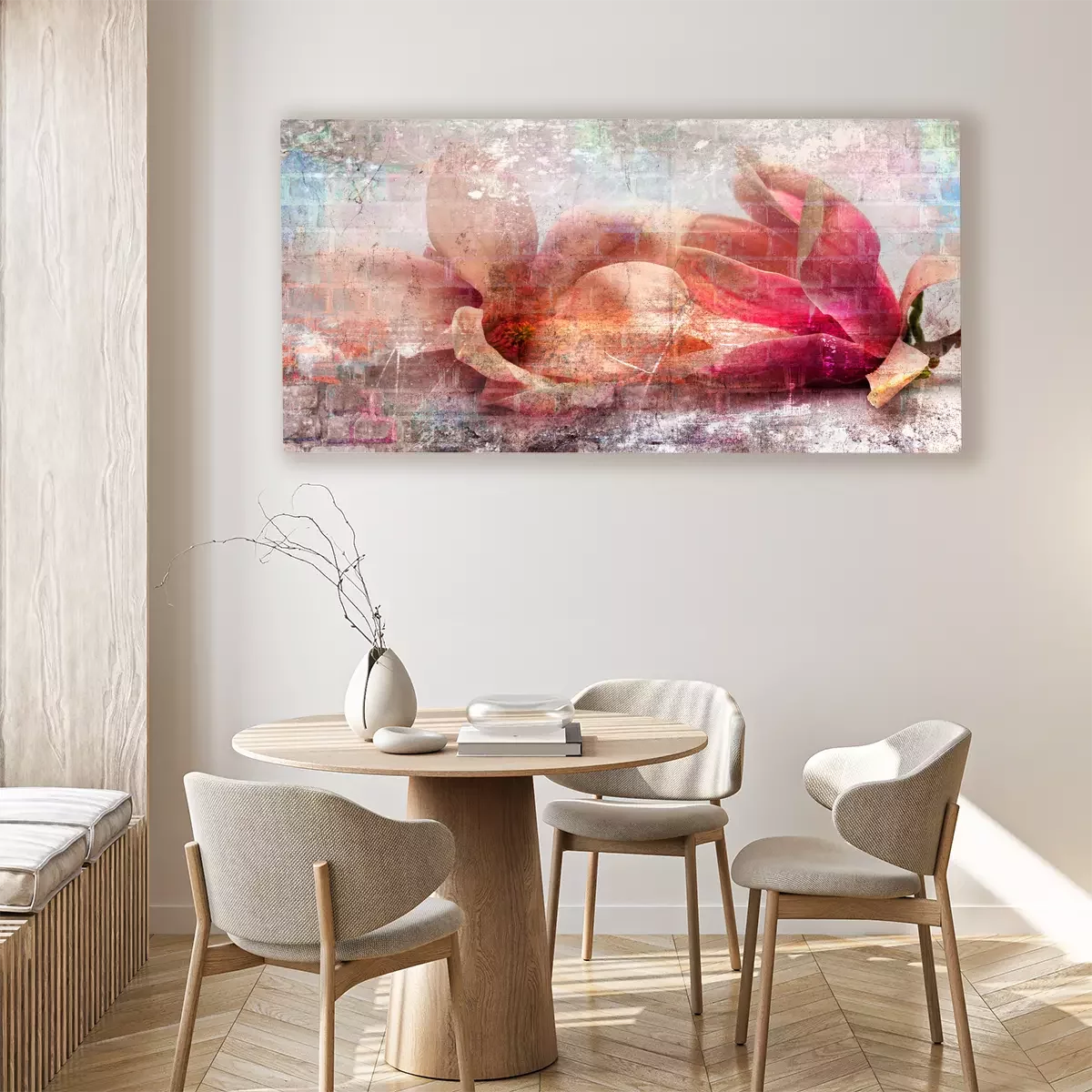 Magnoliabloemen in een pastelcompositie met baksteen