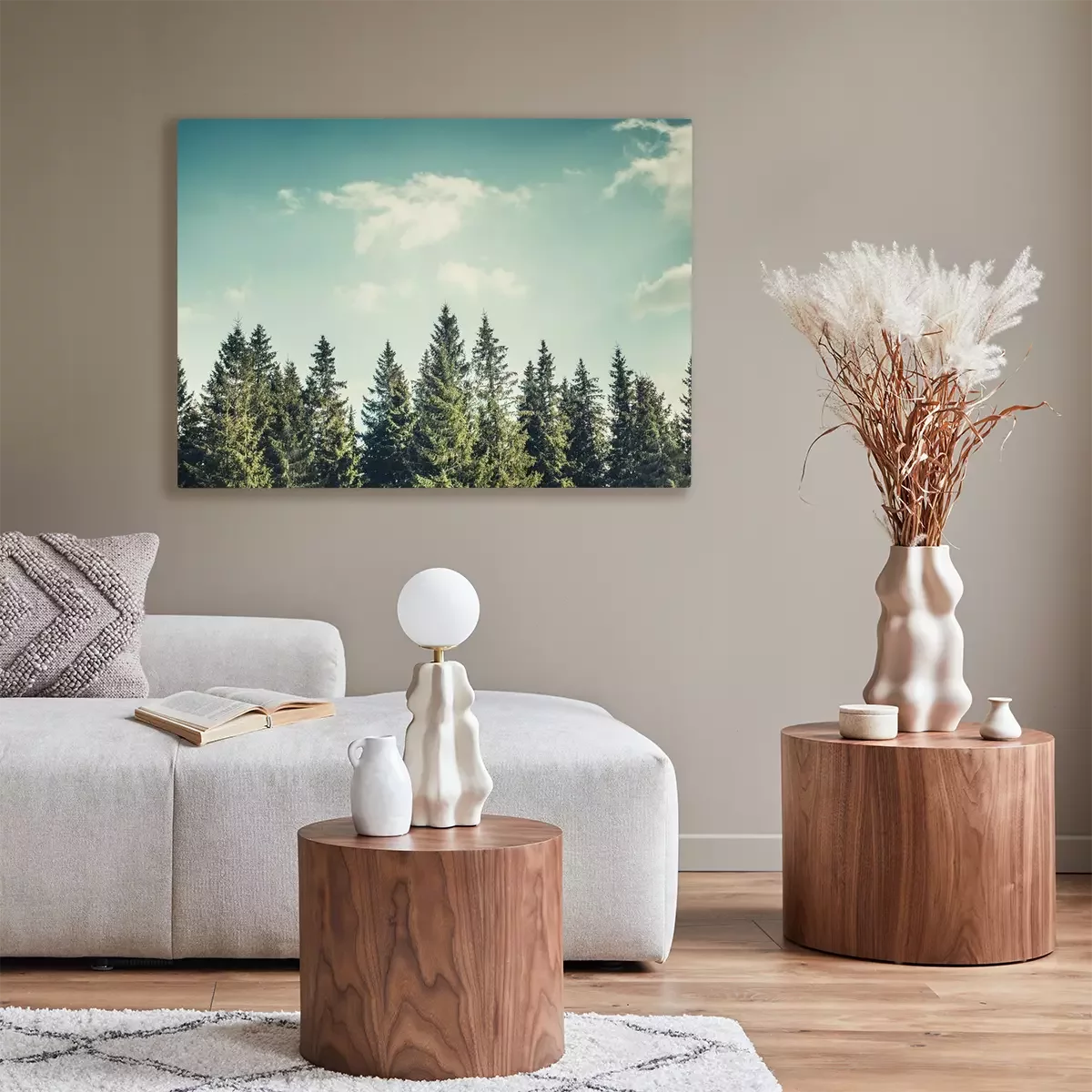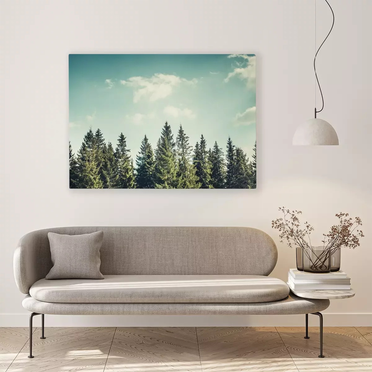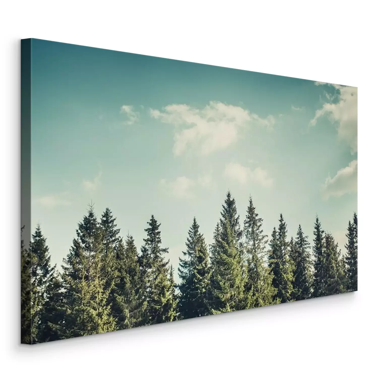 Canvas: Majestueus bos in de bergen vallei. Dramatische en pittoreske ochtend scene. Vintage toning effect. Karpaten, Oekraïne, Europa. Beauty worldmountain landschap op de blauwe hemel achtergrond