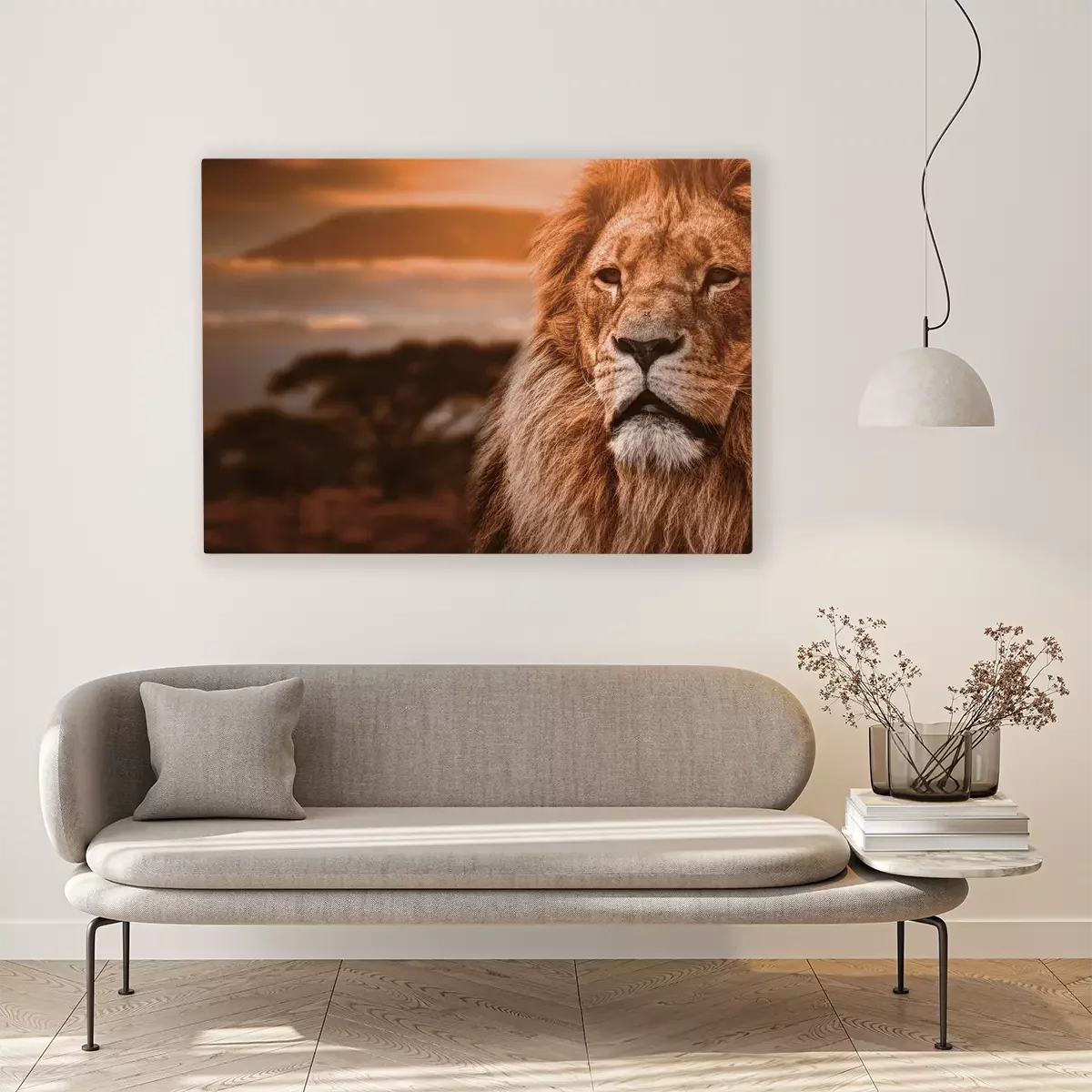 Canvas: Majestueus portret van een volwassen leeuw tegen de achtergrond van de savanne