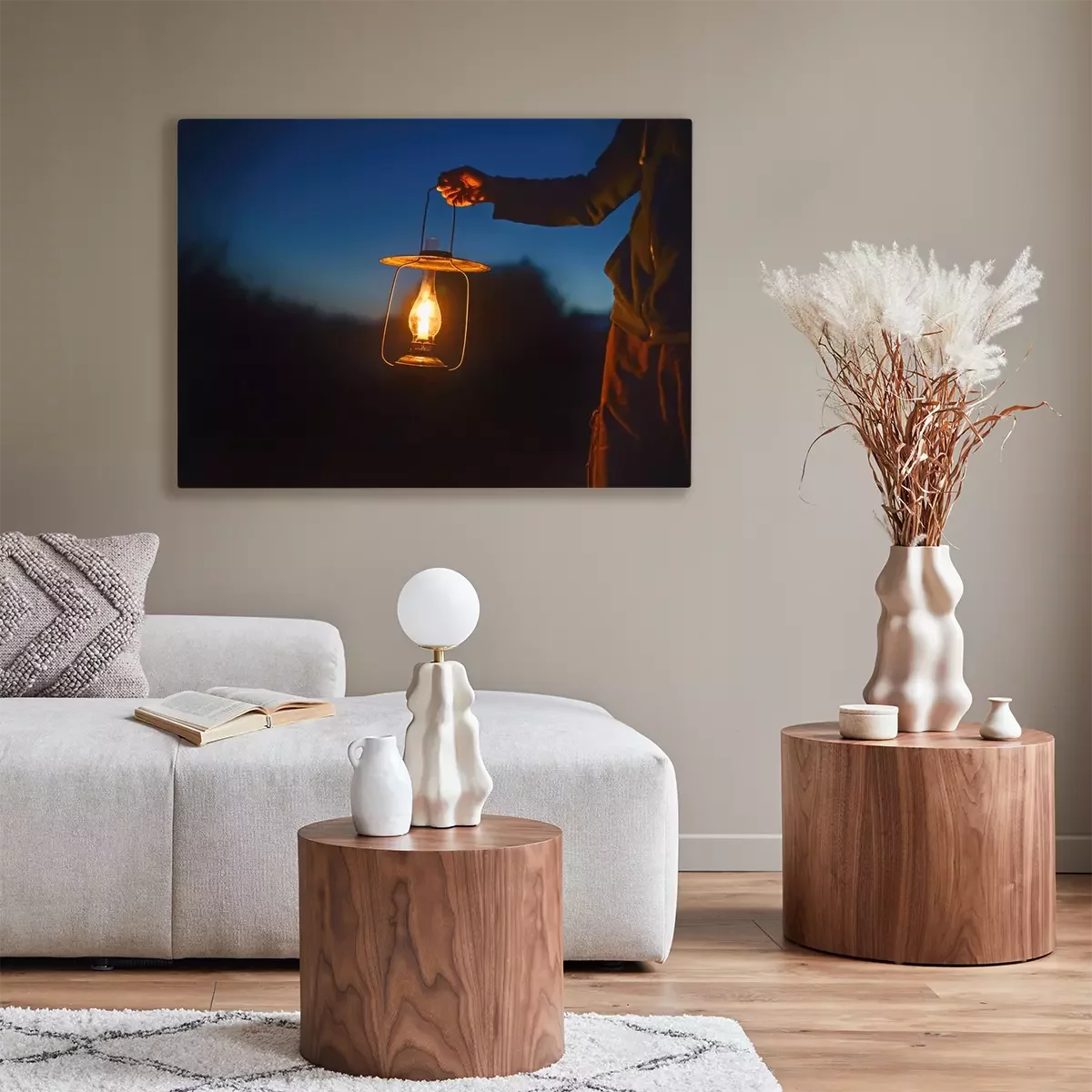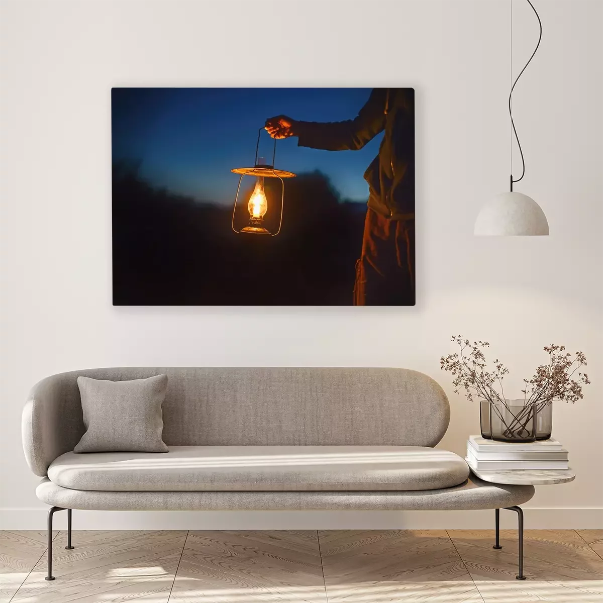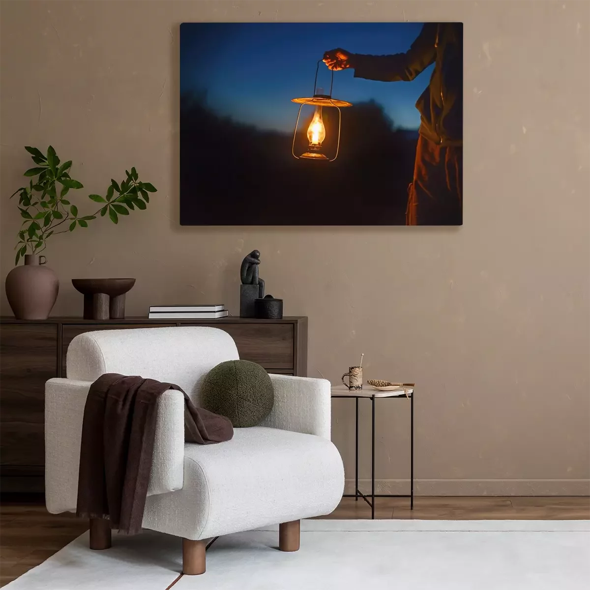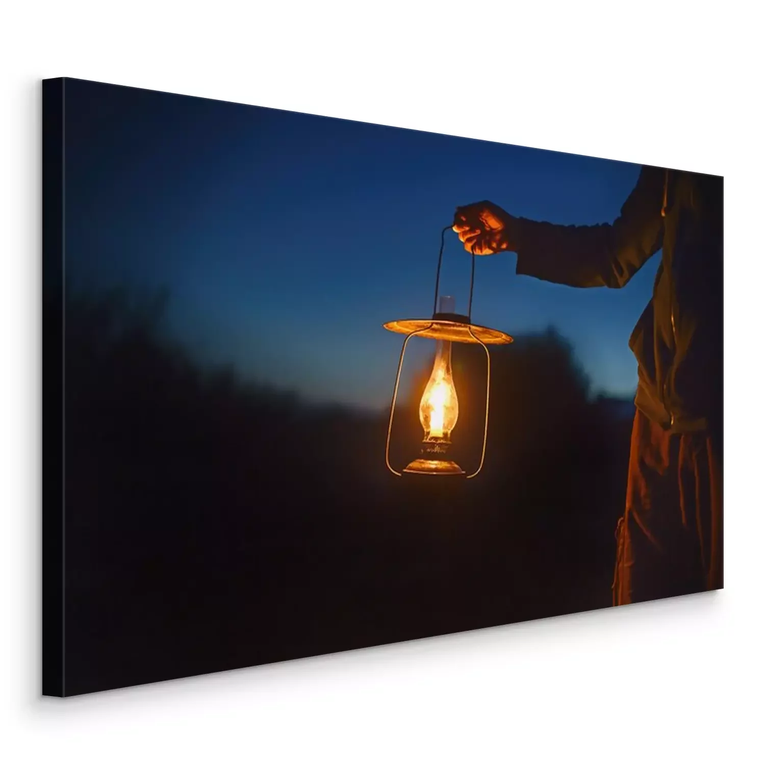 Canvas: man die de oude lamp met een kaars buiten. hand houdt een grote lamp in het donker. oude lantaarn met een kaars verlicht de weg op een avond