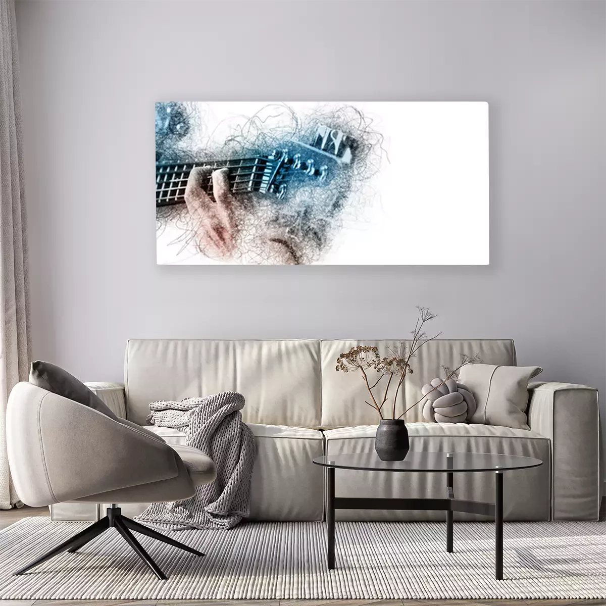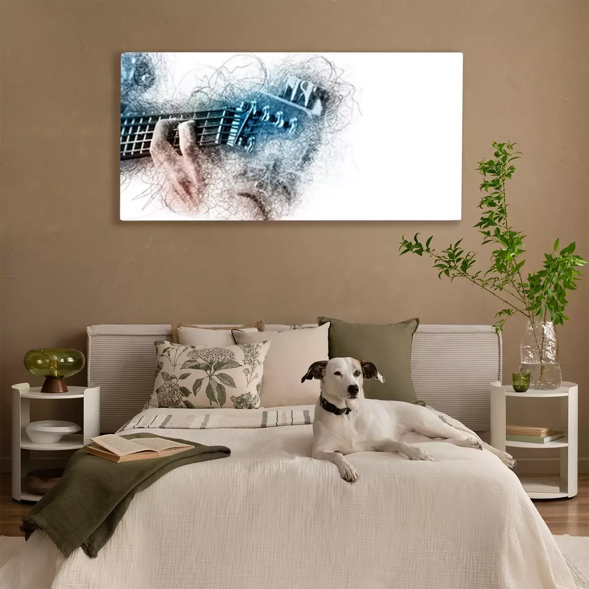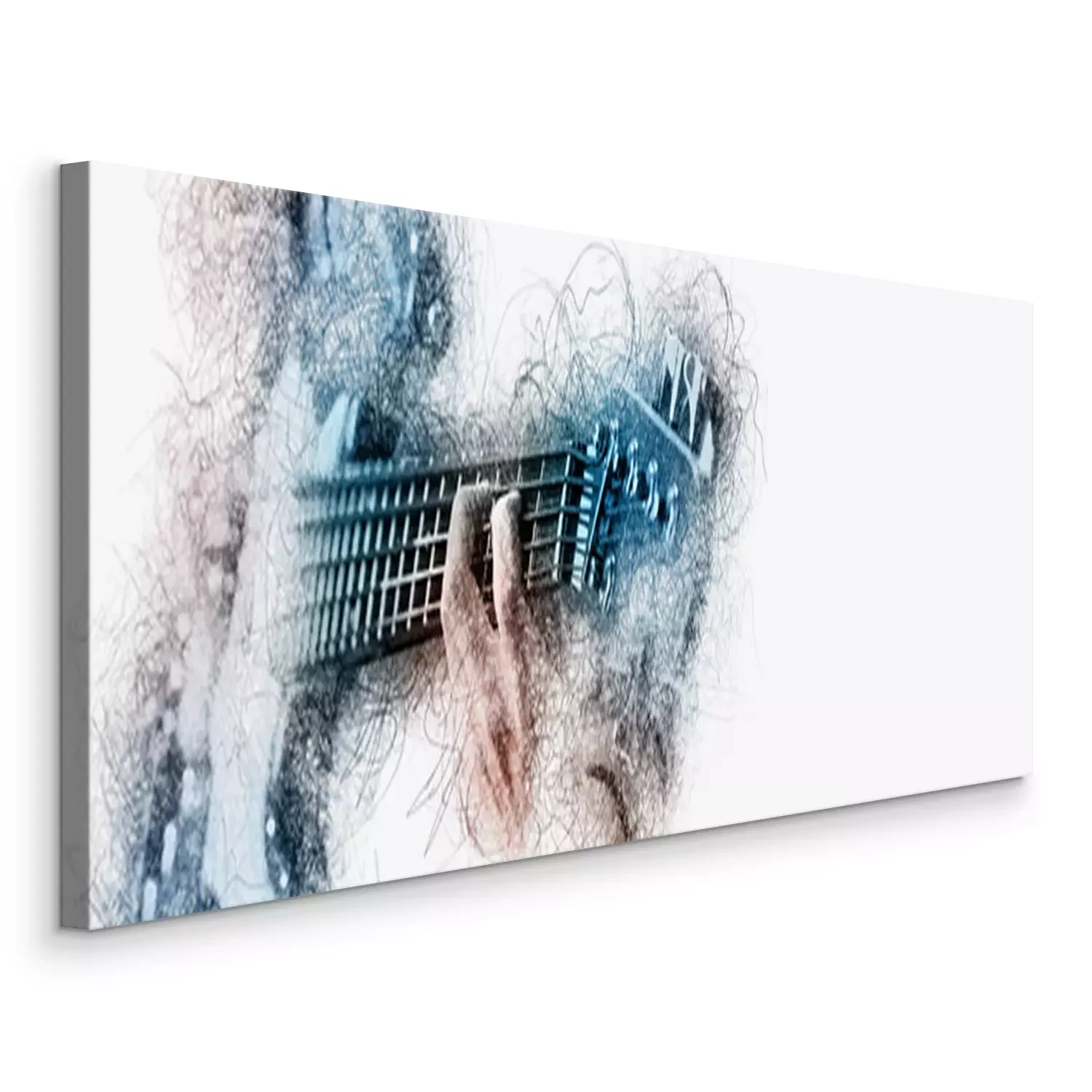 Canvas Man holding playing a guitar, blue brown color image with digital effects sketch silhouette on white panoramic background copy free space for your conceptual advertisement text