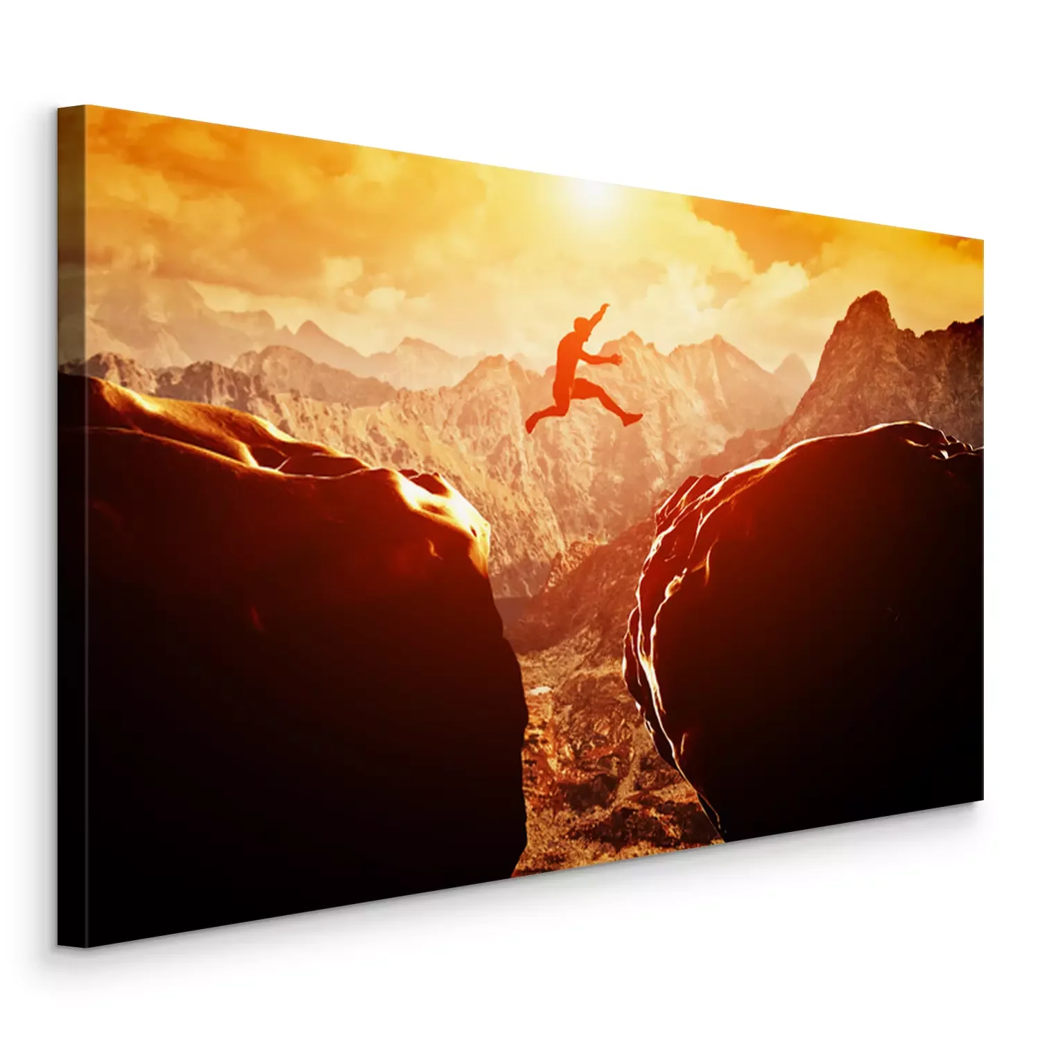 Canvas Man springen over de afgrond tussen twee bergen bij zonsondergang