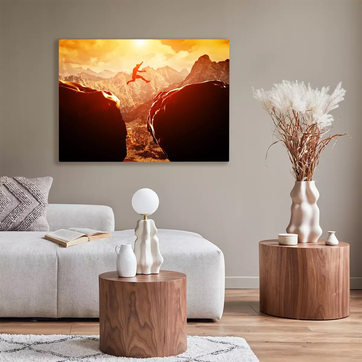Canvas: Man springen over de afgrond tussen twee bergen bij zonsondergang