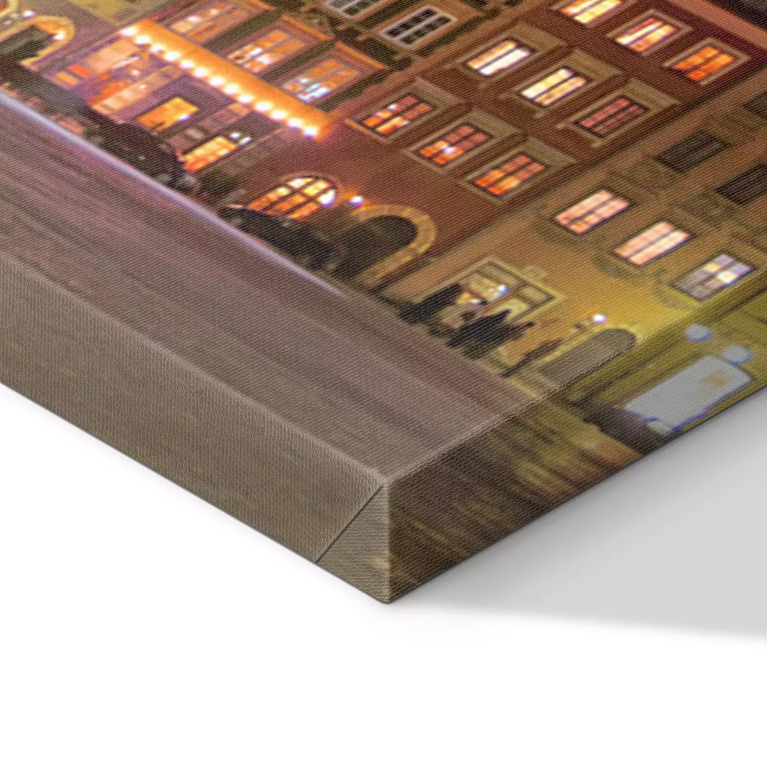 De print wordt aangebracht op hoogwaardig canvas dat op een schildersweefgetouw (spieraam) wordt gespannen. Omdat de print de zijranden bedekt, hoeft het ontwerp niet met een extra kader te worden omlijst. Wij raden ook composities aan die uit meerdere foto's bestaan en zo een coherente compositie vormen.