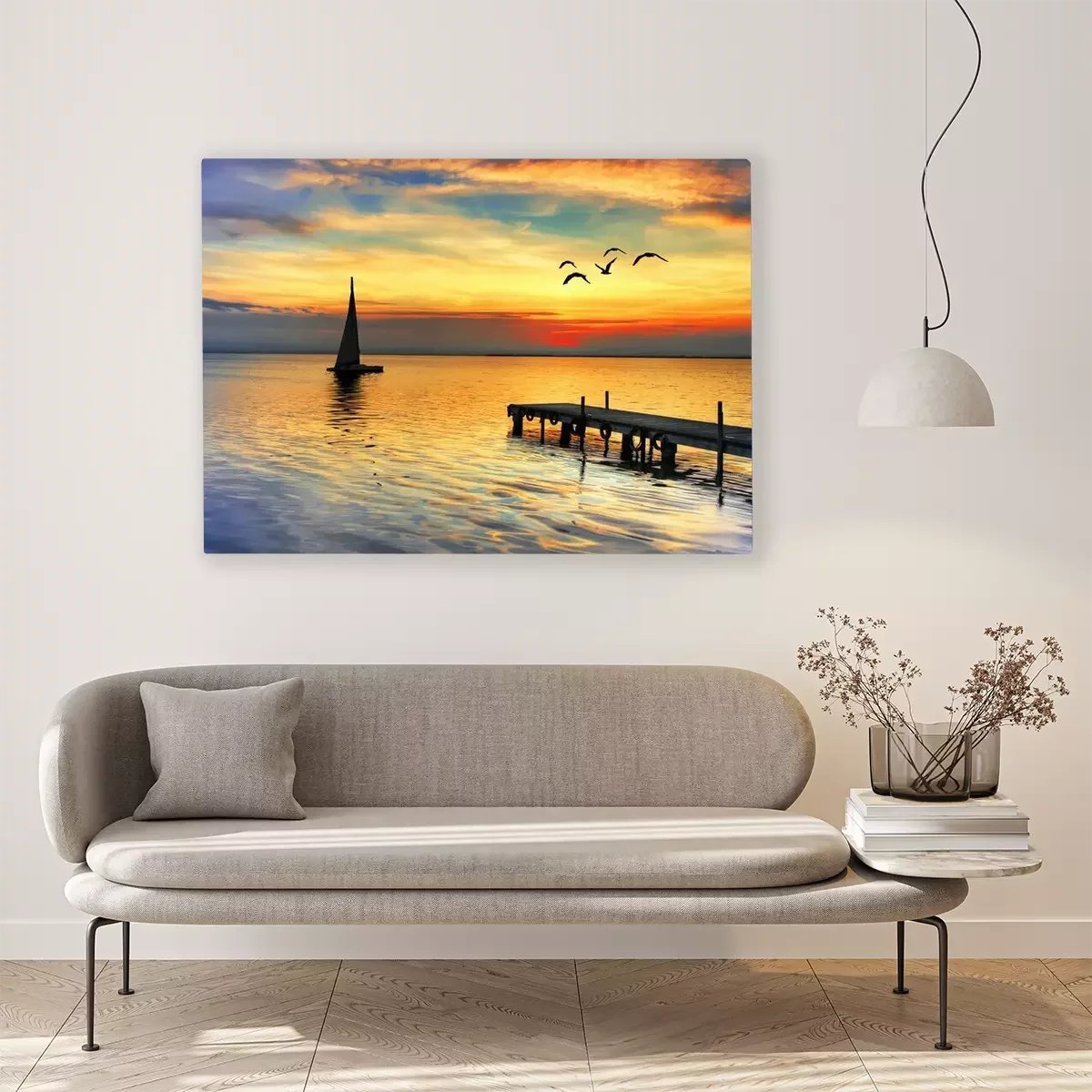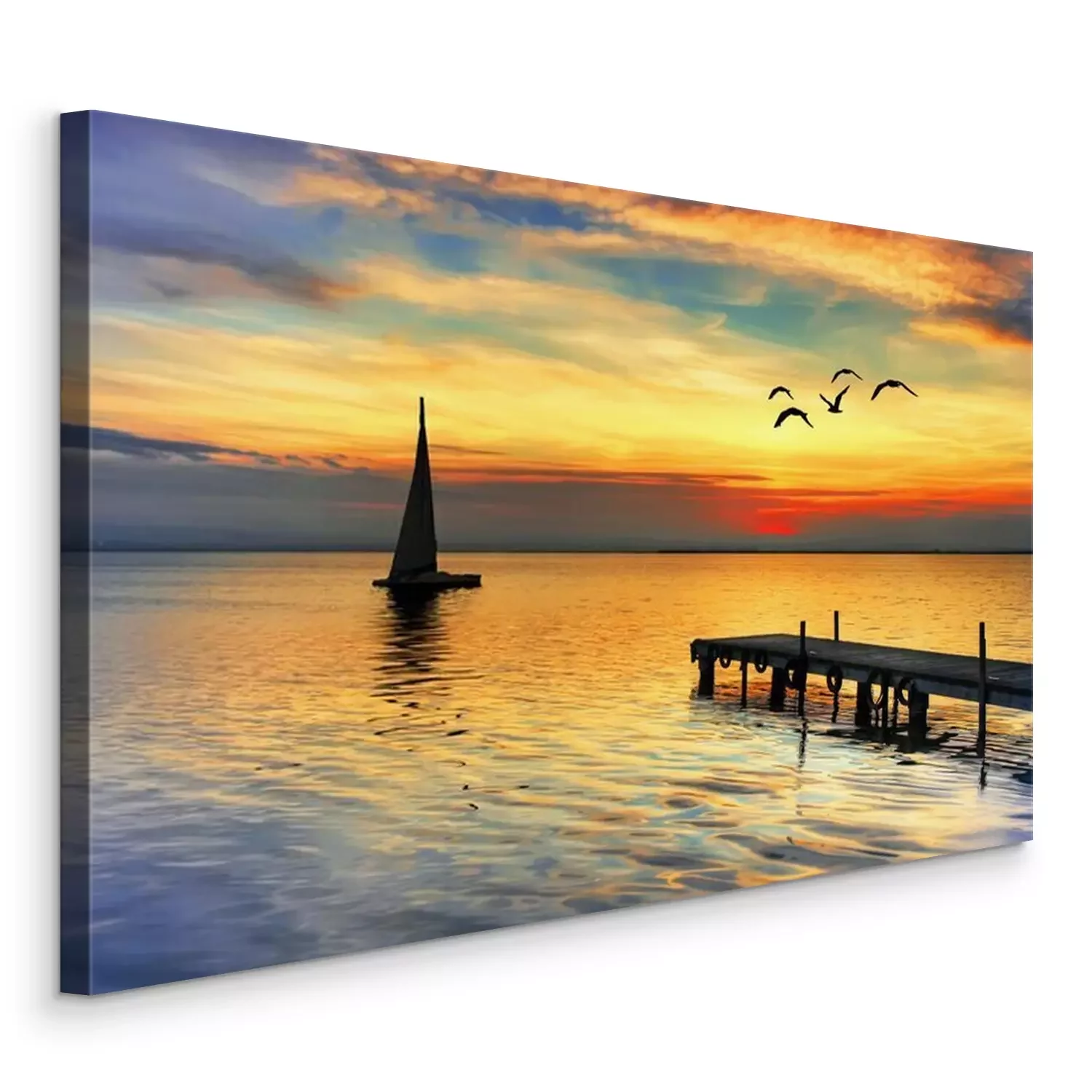 Canvas: Meeuwen en zeilboot bij zonsondergang