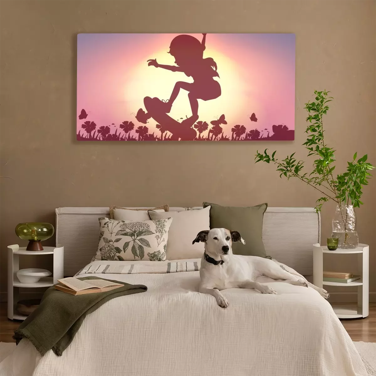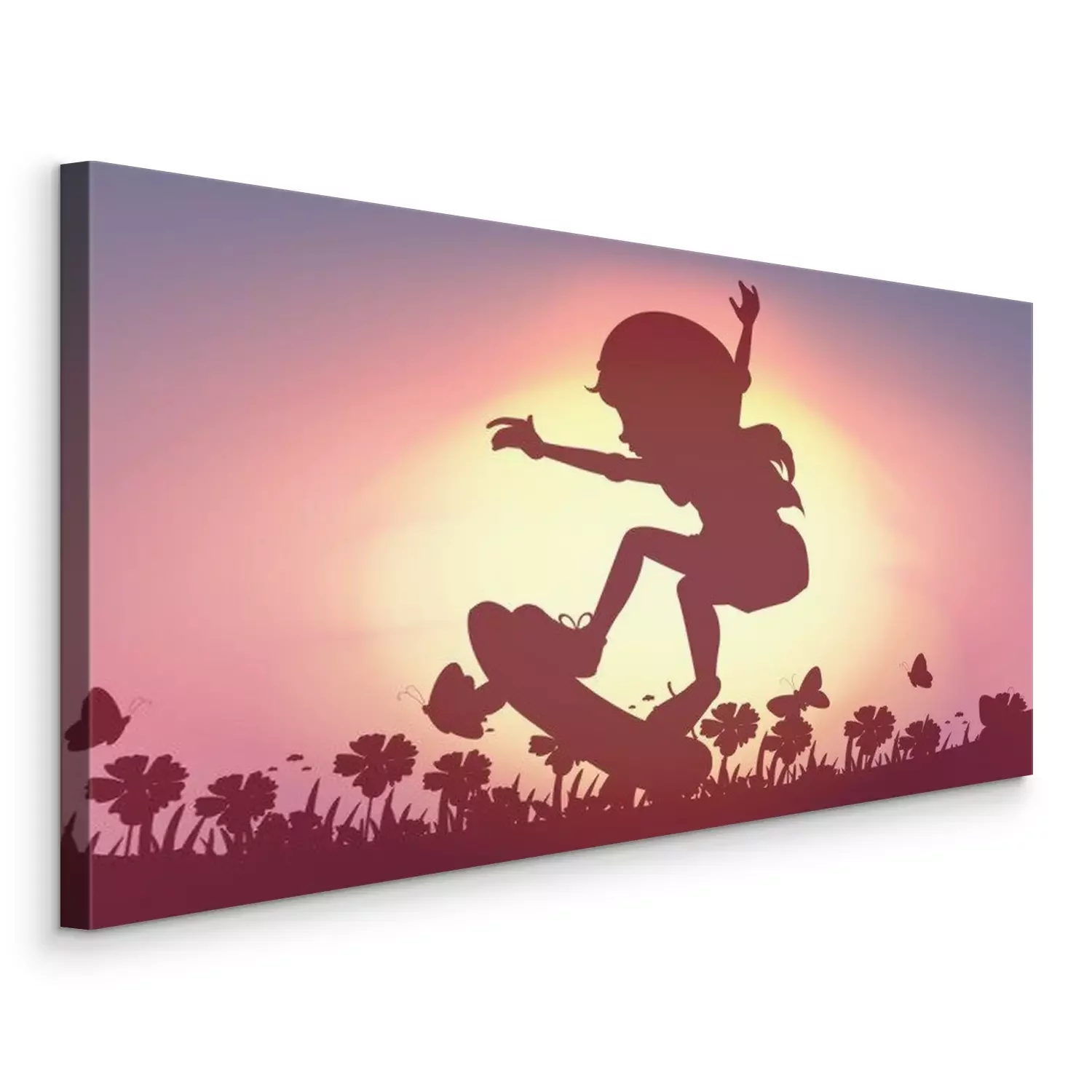 Canvas Meisje op skateboard tussen veldbloemen