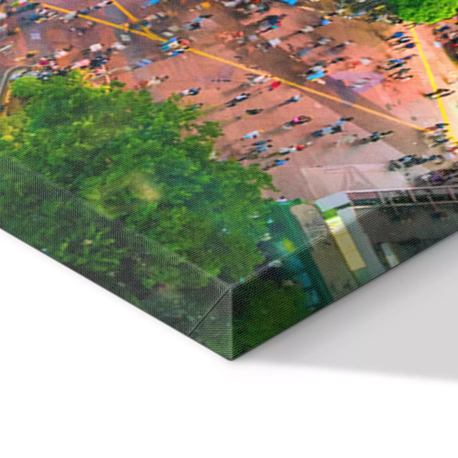 De print wordt aangebracht op hoogwaardig canvas dat op een schildersweefgetouw (spieraam) wordt gespannen. Omdat de print de zijranden bedekt, hoeft het ontwerp niet met een extra kader te worden omlijst. Wij raden ook composities aan die uit meerdere foto's bestaan en zo een coherente compositie vormen.