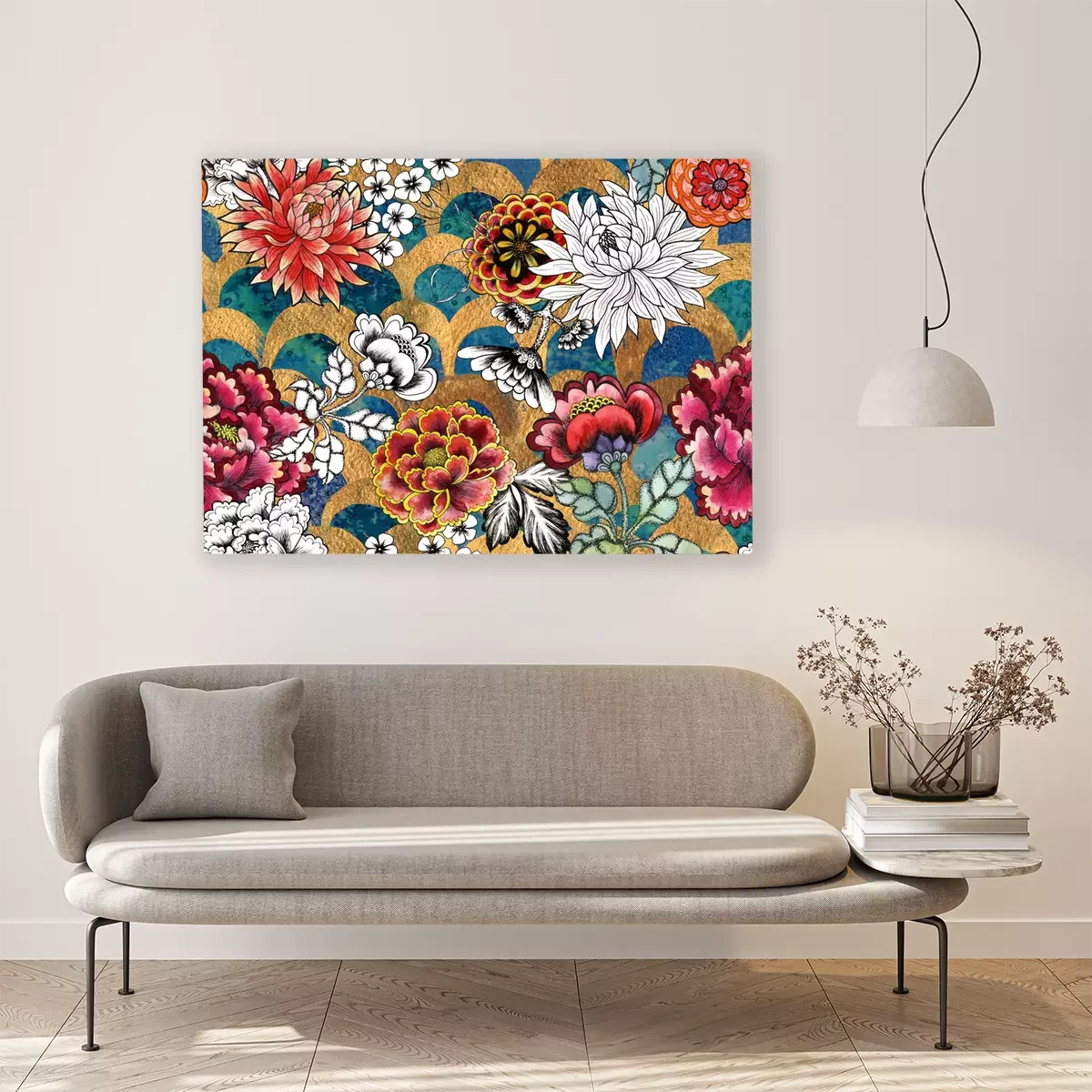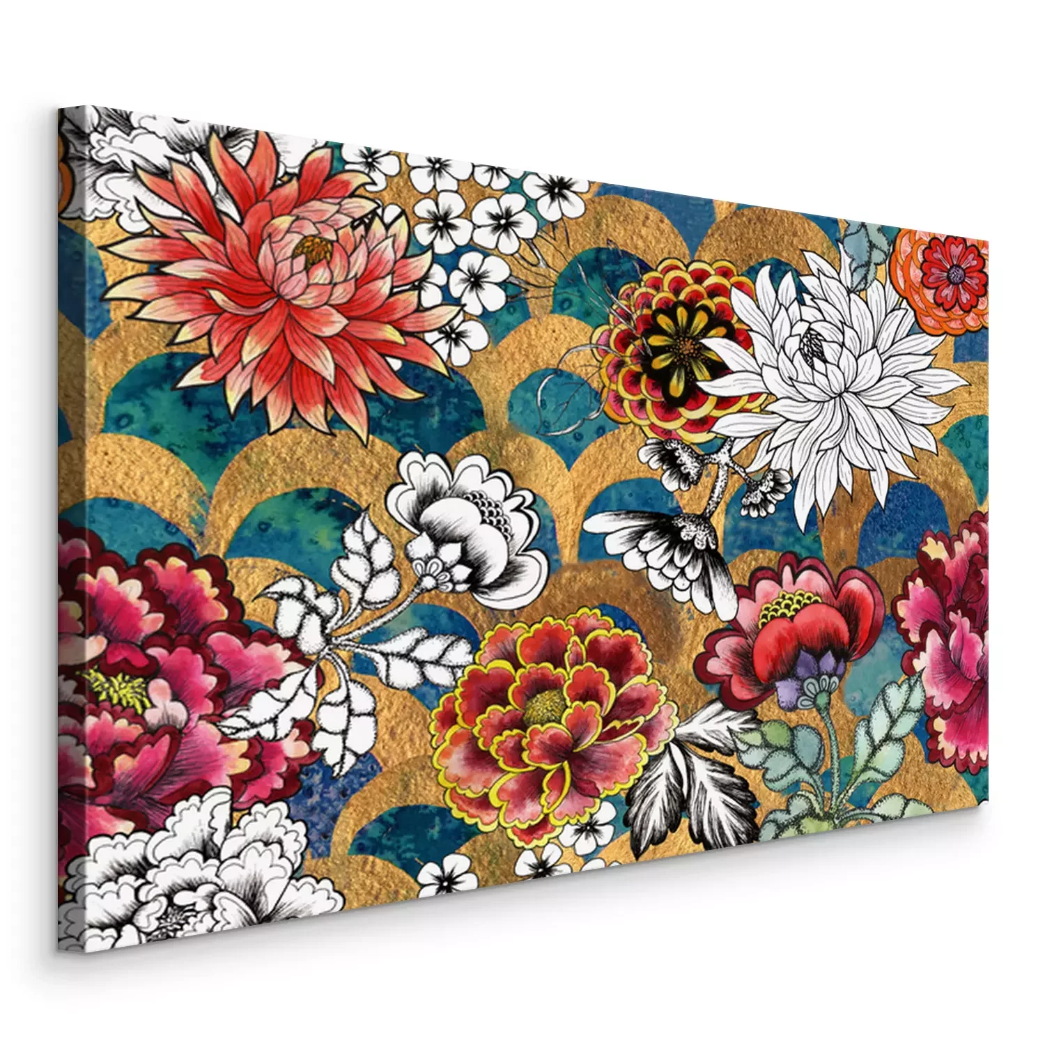 Canvas Mermaid fish scale wave japanese luxury seamless pattern. Watercolor hand drawn dark teal turquoise background with gold line. Japanese painted flowers peonies, chrysanthemums, dahlias