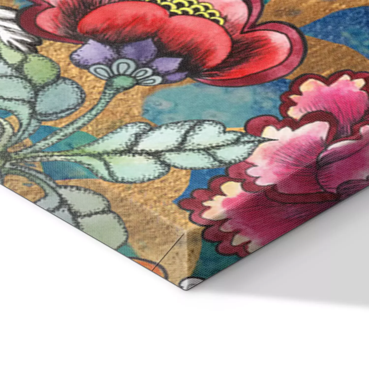 De print wordt aangebracht op hoogwaardig canvas dat op een schildersweefgetouw (spieraam) wordt gespannen. Omdat de print de zijranden bedekt, hoeft het ontwerp niet met een extra kader te worden omlijst. Wij raden ook composities aan die uit meerdere foto's bestaan en zo een coherente compositie vormen.