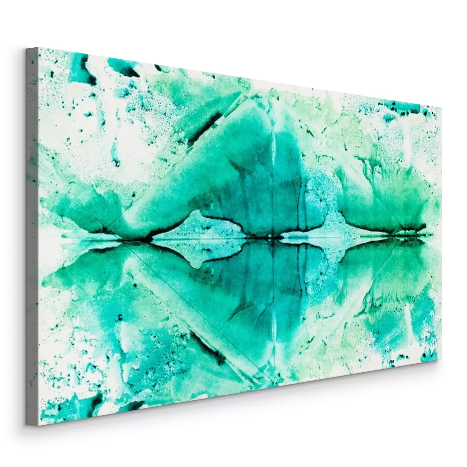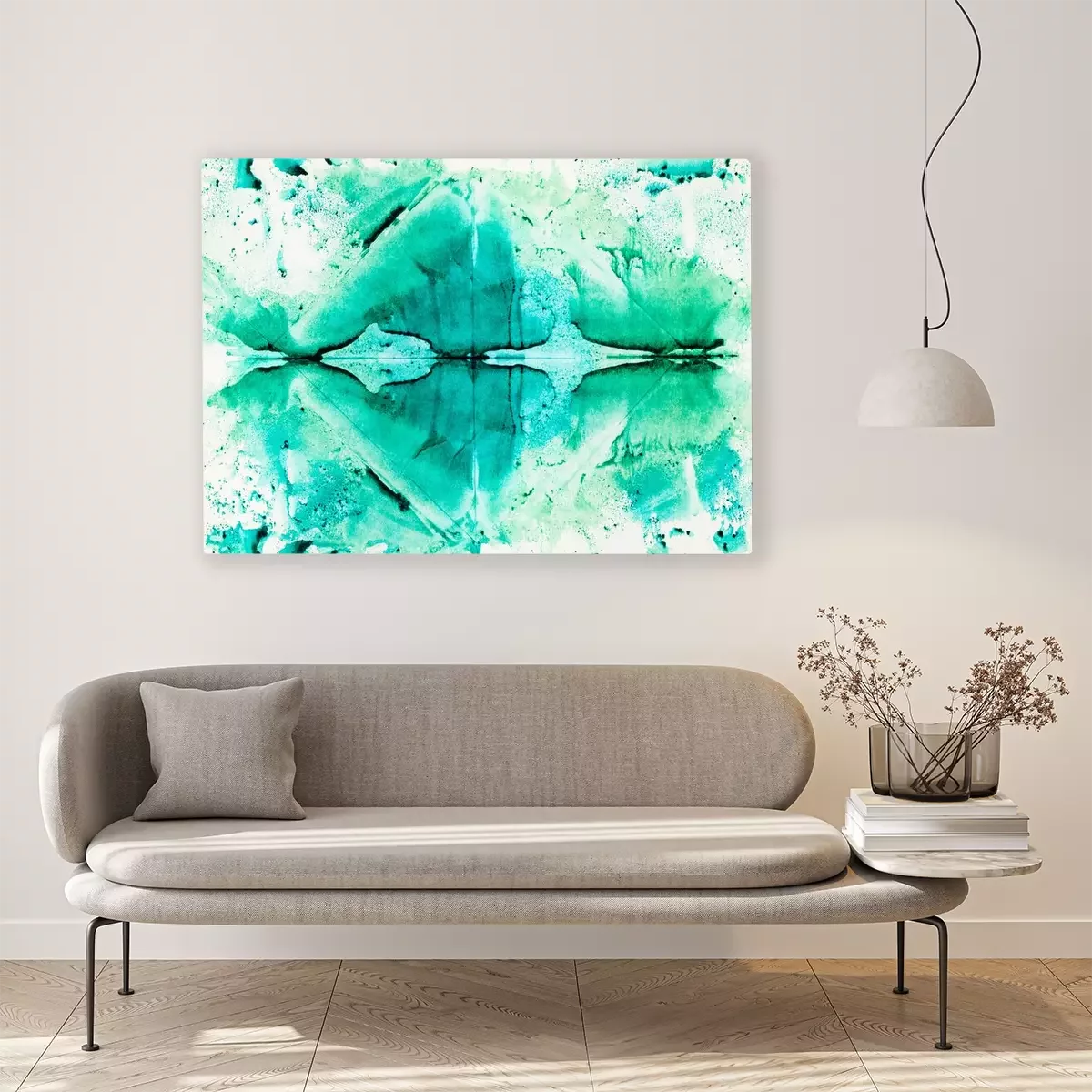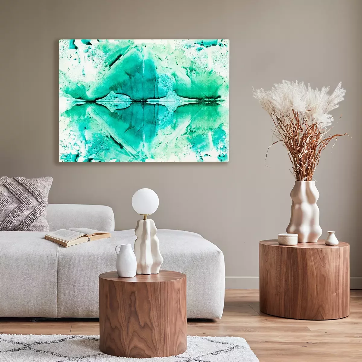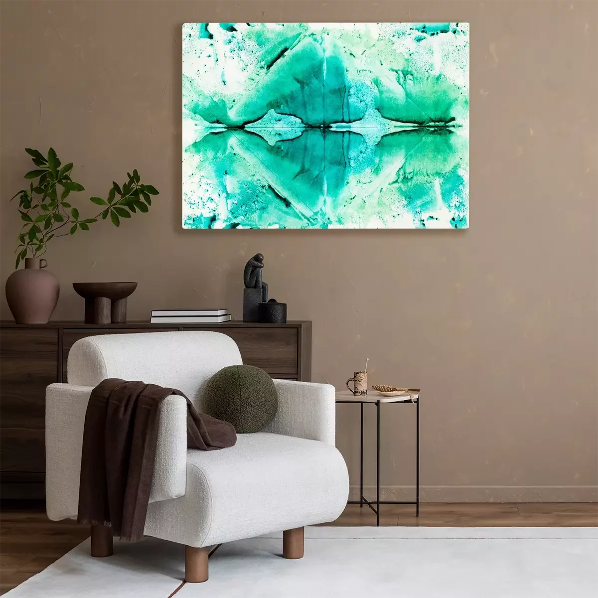 Canvas minimalist art - abstract symmetric monotyping painting handcrafted with green watercolor on old paper