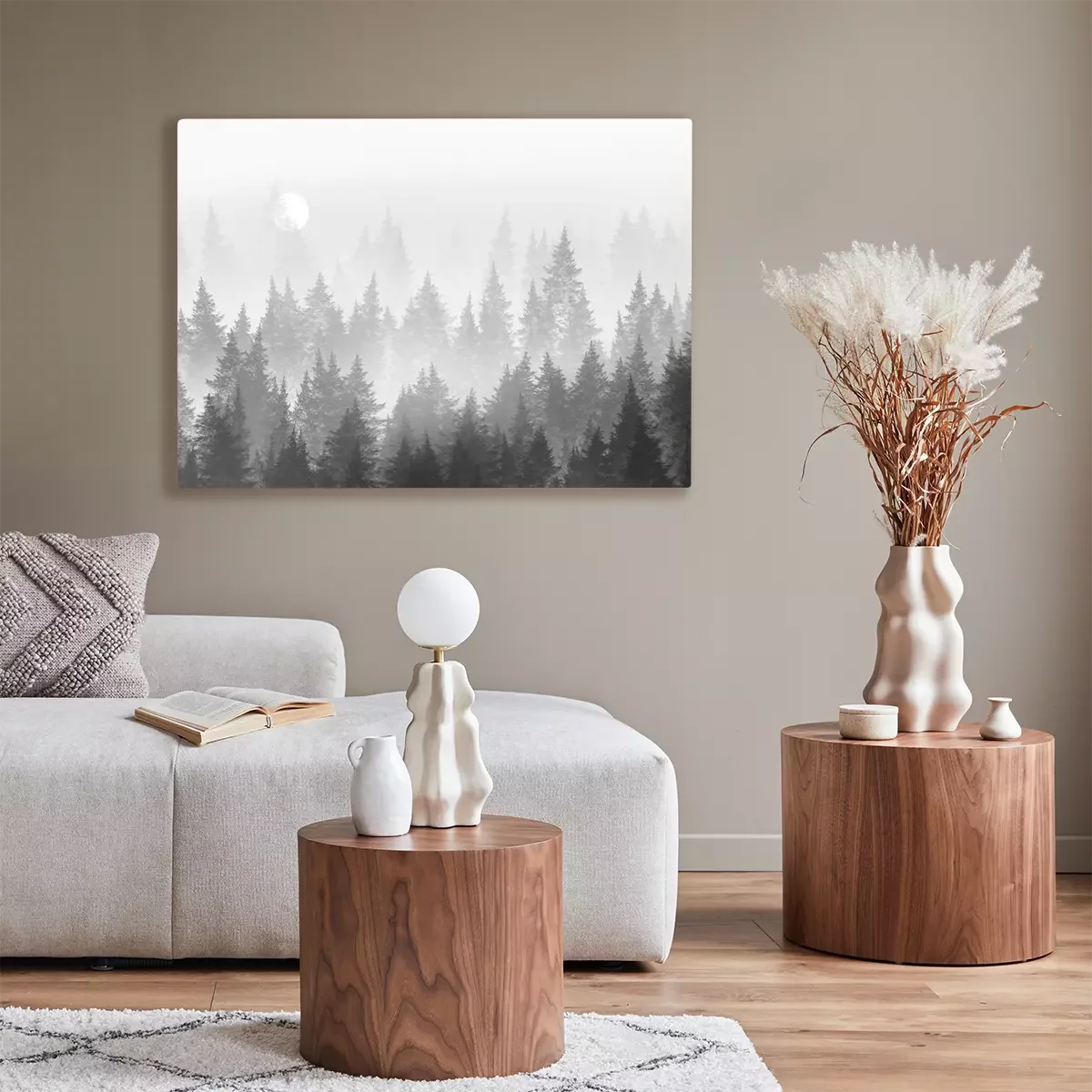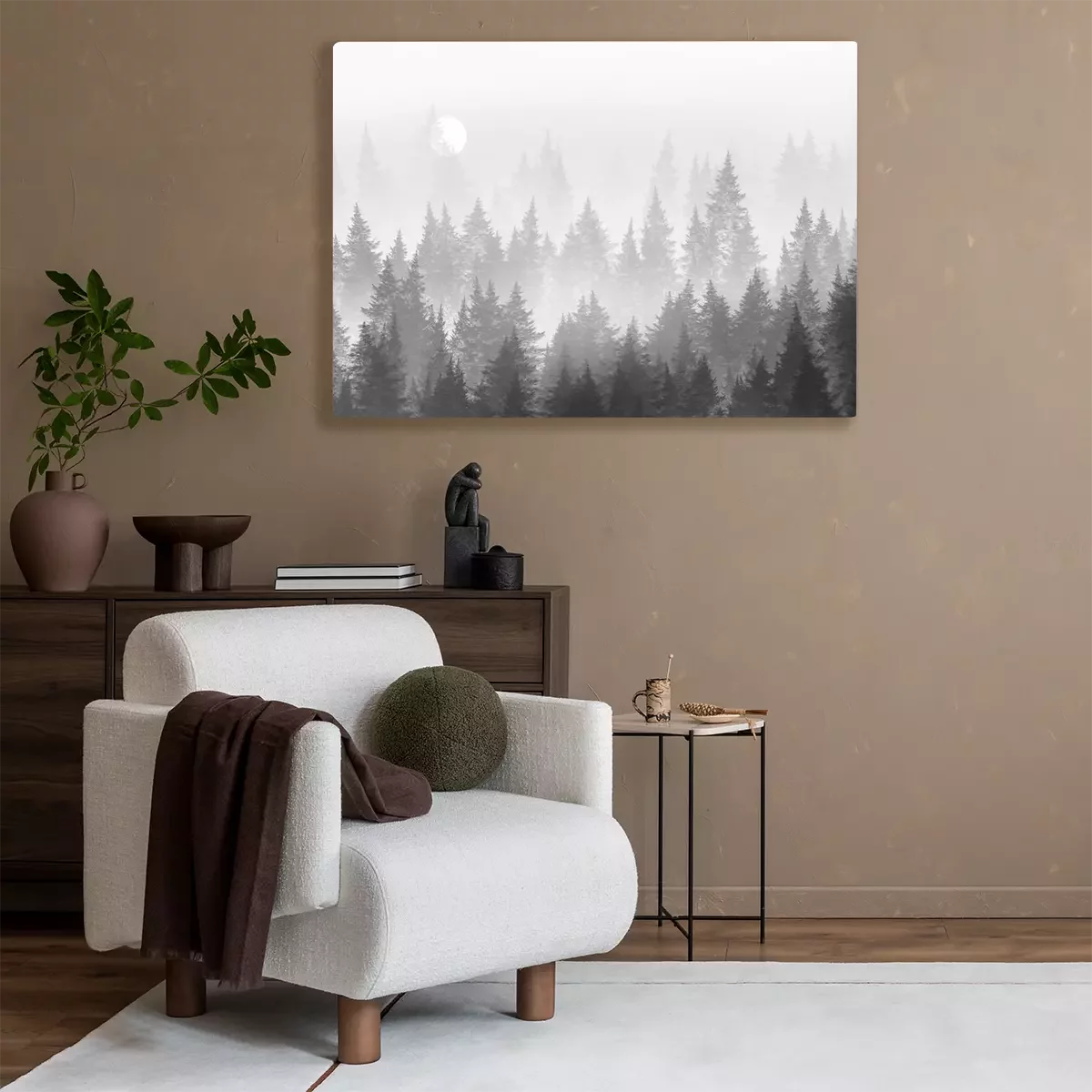 Canvas: Minimalistisch bos in mist. Digitaal schilderij.