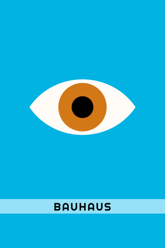 Minimalistisch oog met bauhaus-letters in blauwtinten
