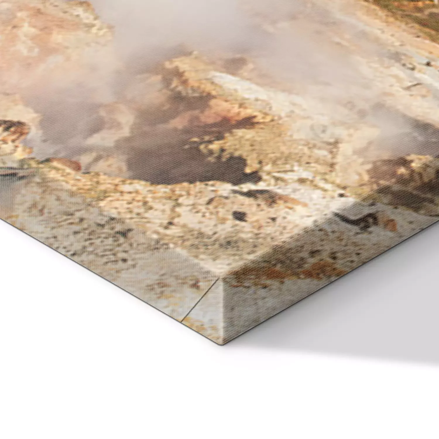De print wordt aangebracht op hoogwaardig canvas dat op een schildersweefgetouw (spieraam) wordt gespannen. Omdat de print de zijranden bedekt, hoeft het ontwerp niet met een extra kader te worden omlijst. Wij raden ook composities aan die uit meerdere foto's bestaan en zo een coherente compositie vormen.