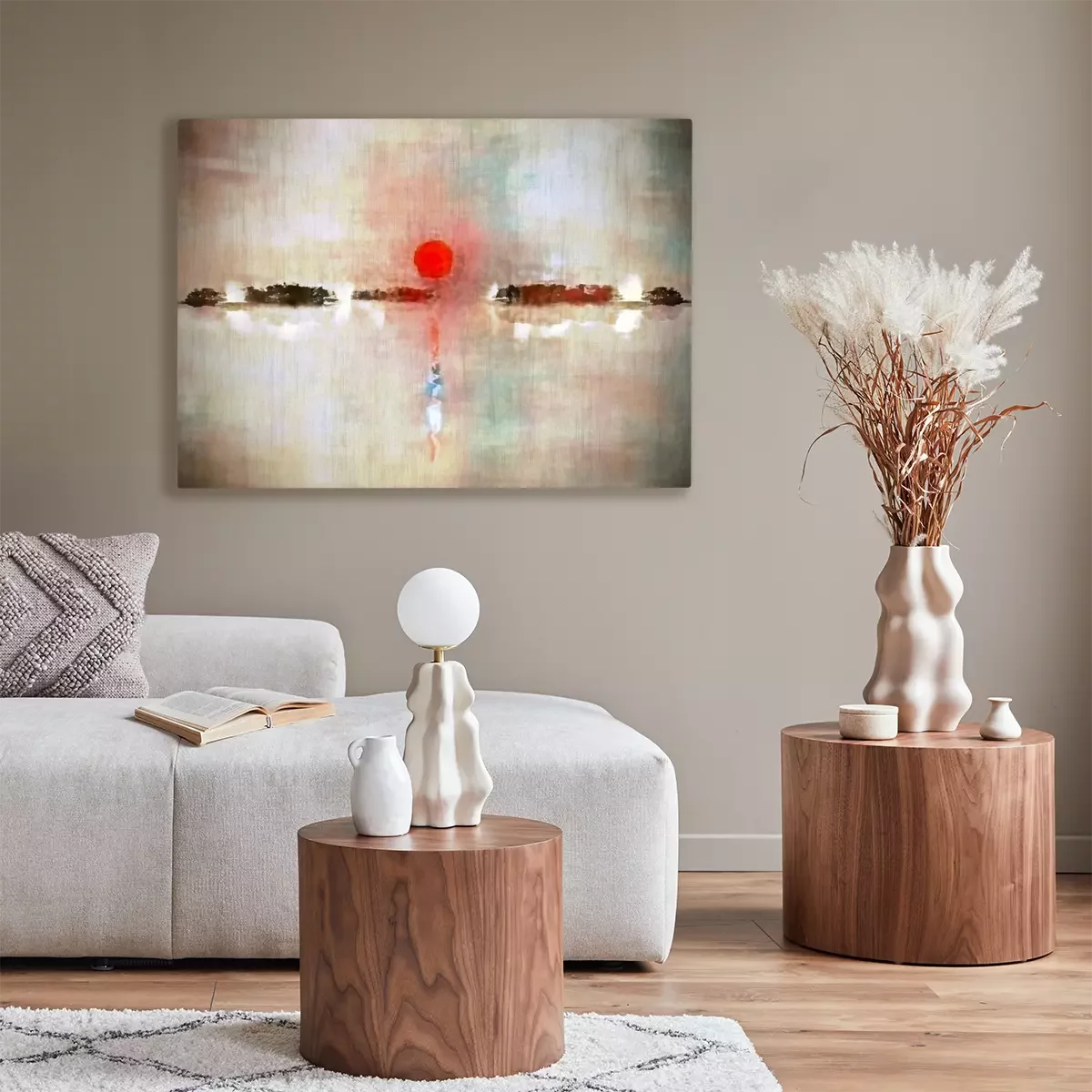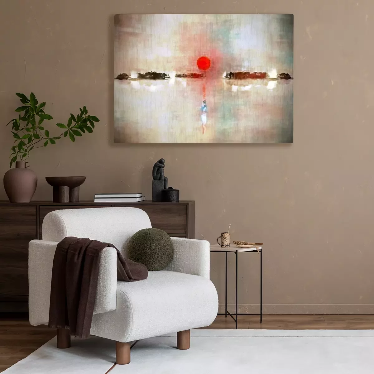Canvas: Modern abstract painting in sumi-e style. Red sunset over calm water