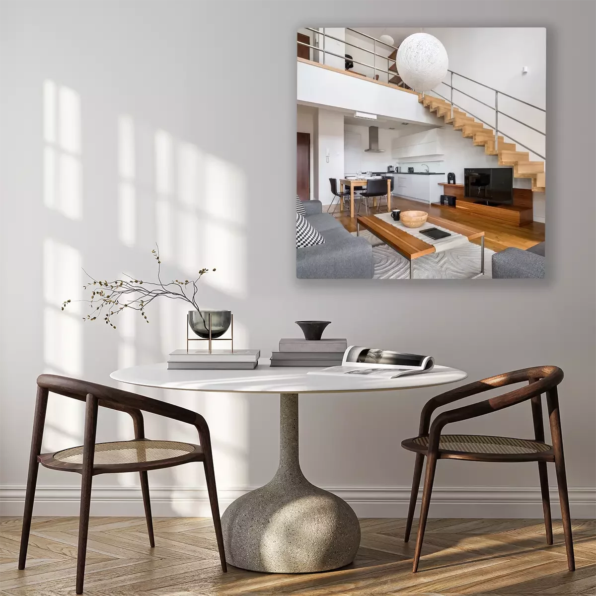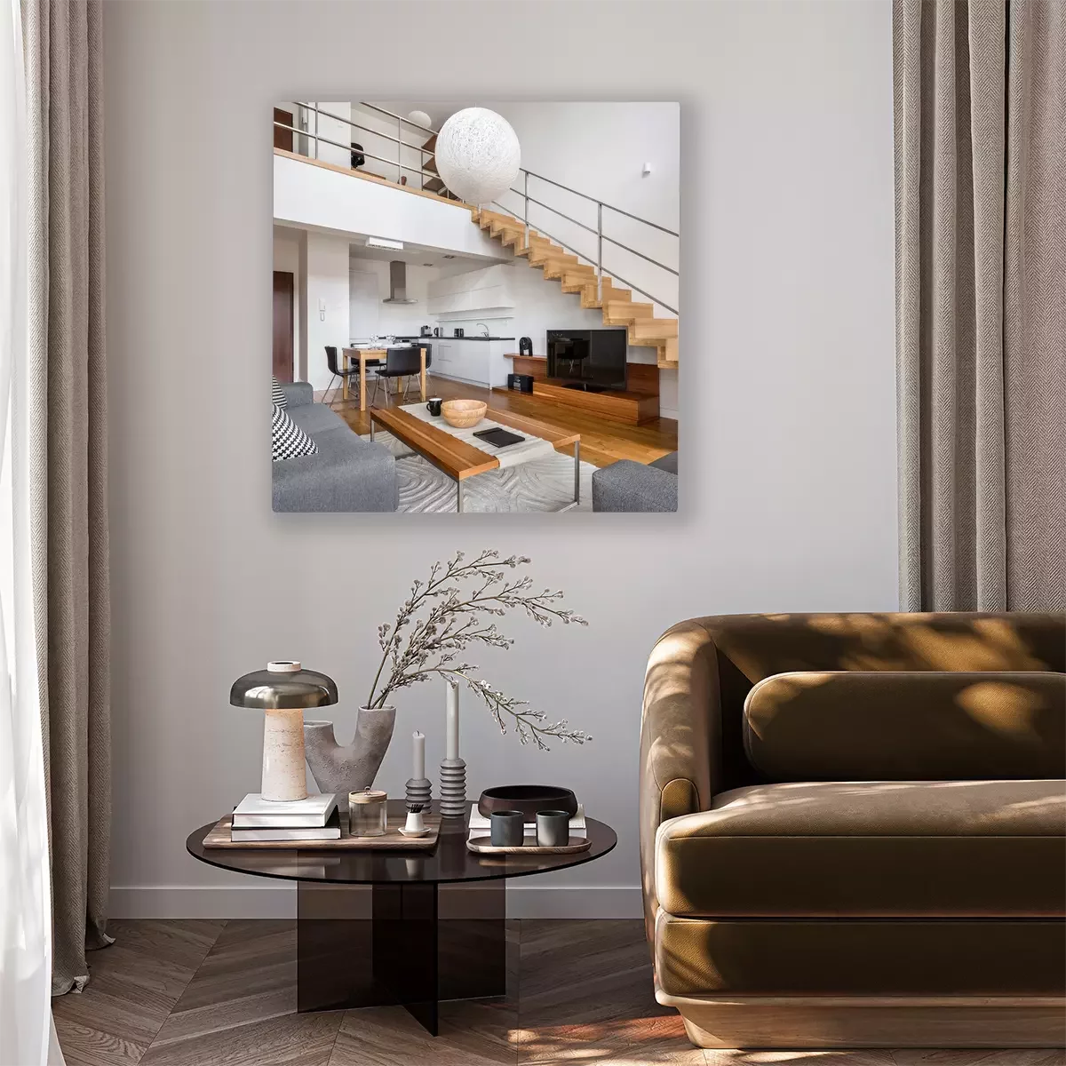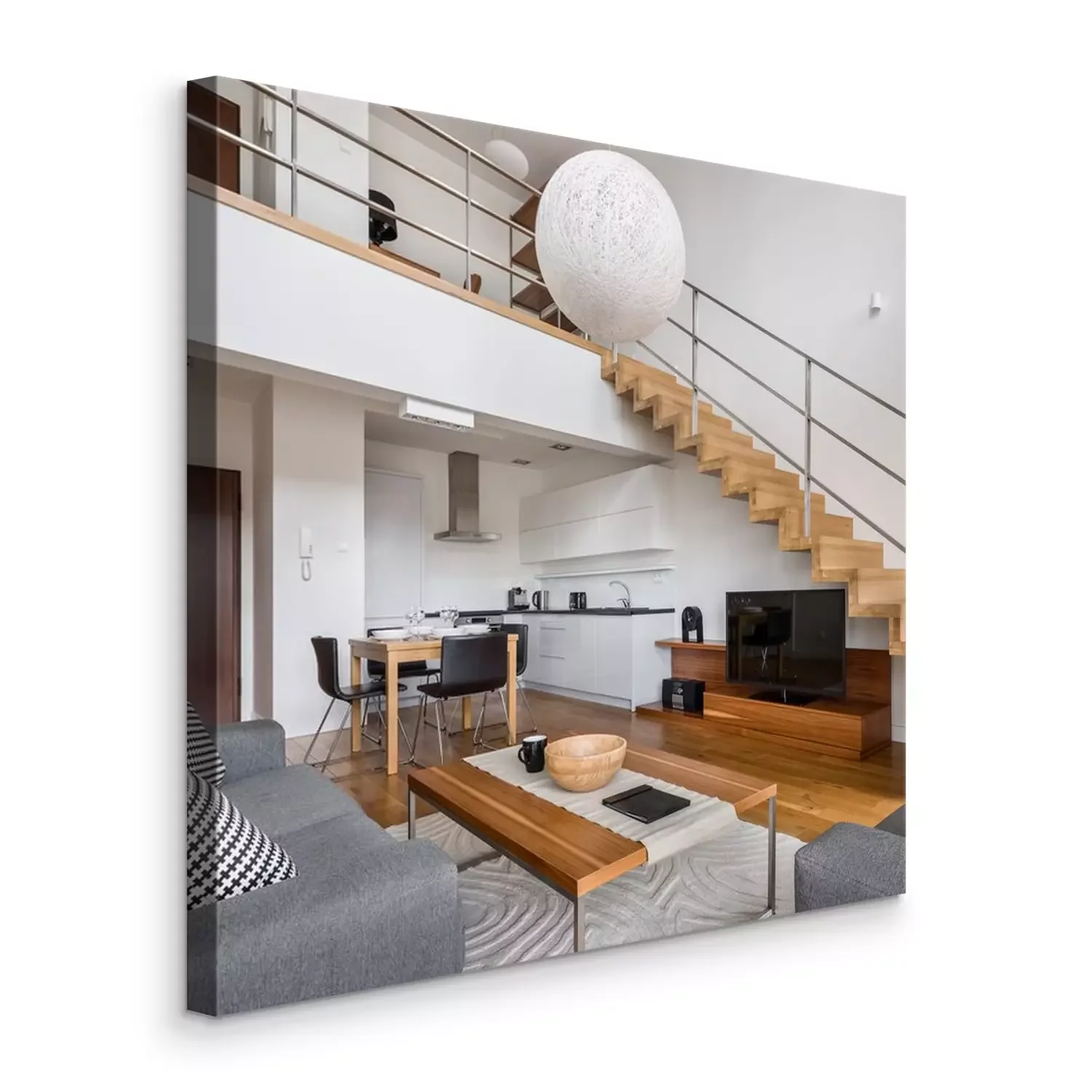 De print wordt aangebracht op hoogwaardig canvas dat op een schildersweefgetouw (spieraam) wordt gespannen. Omdat de print de zijranden bedekt, hoeft het ontwerp niet met een extra kader te worden omlijst. Wij raden ook composities aan die uit meerdere foto's bestaan en zo een coherente compositie vormen.