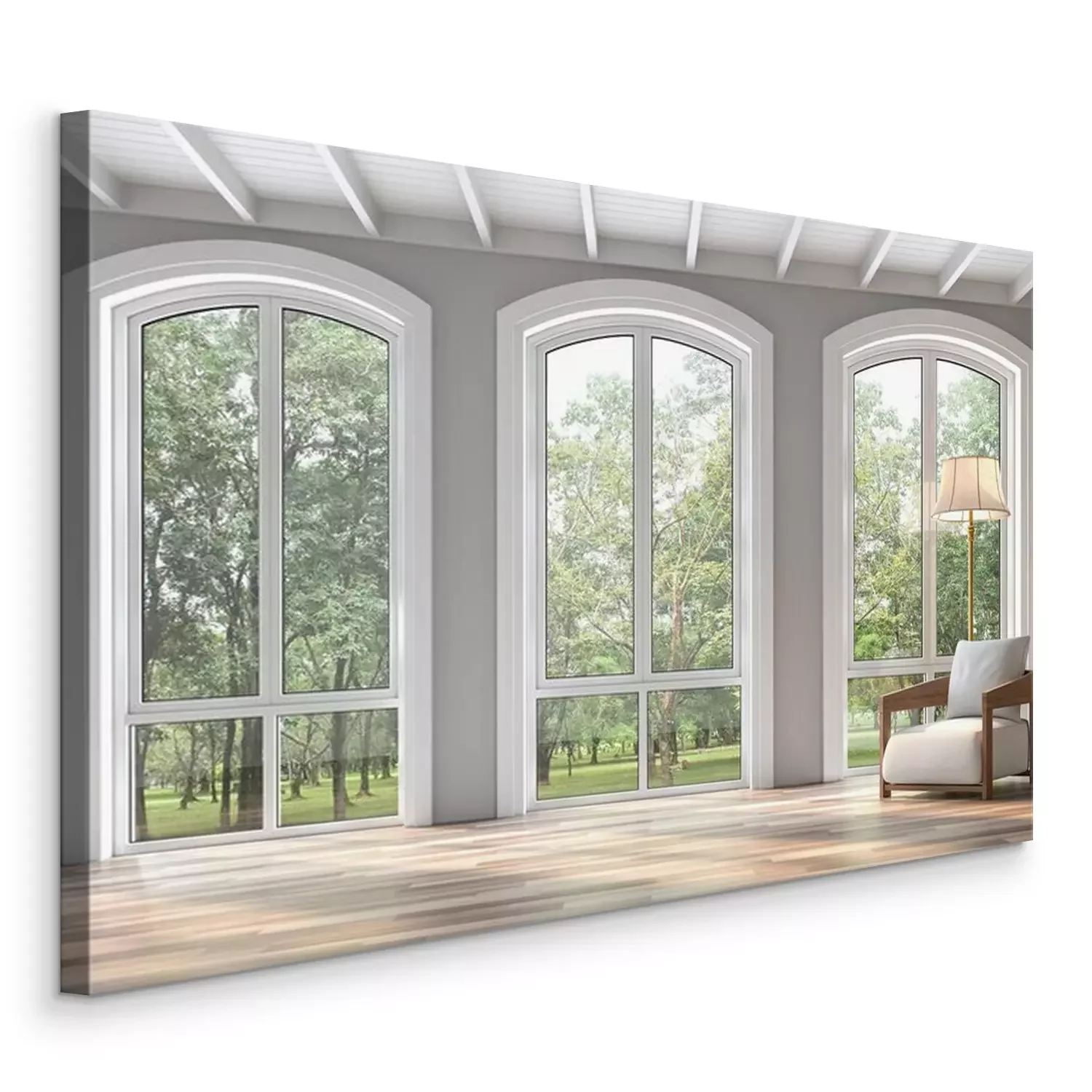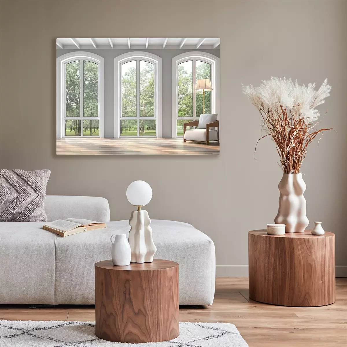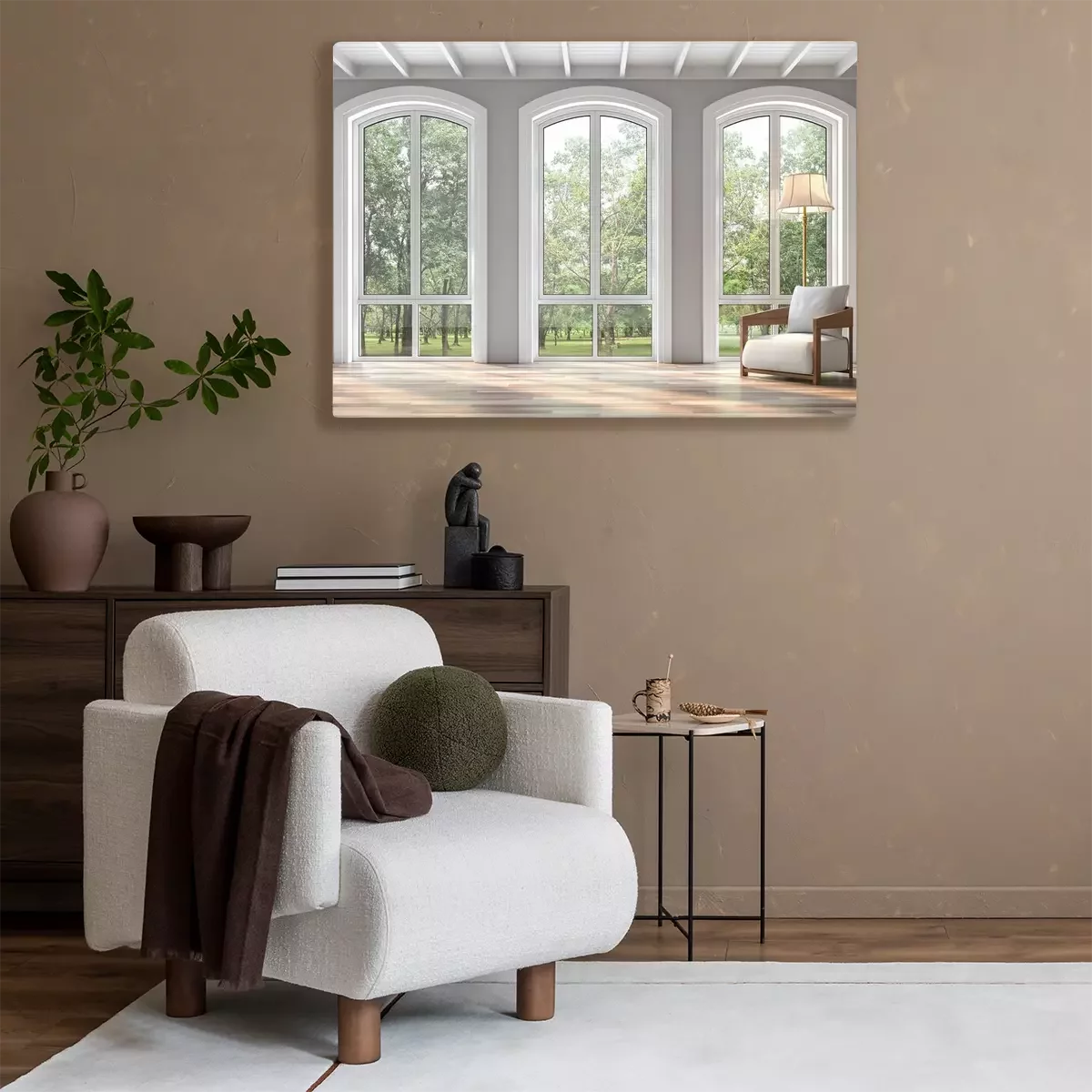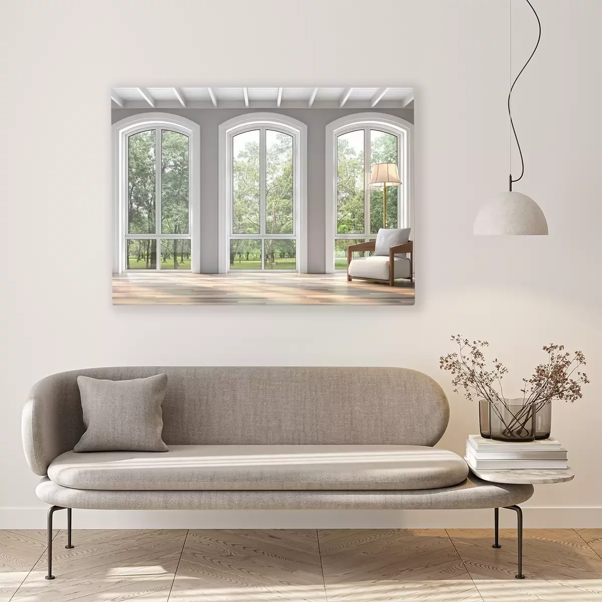 Canvas: Modern classic living room with nature view 3d render.The Rooms have wooden floors and white wood ceilings.Decorated with white fabric chair,There are arch shape window sunlight shining into the room.
