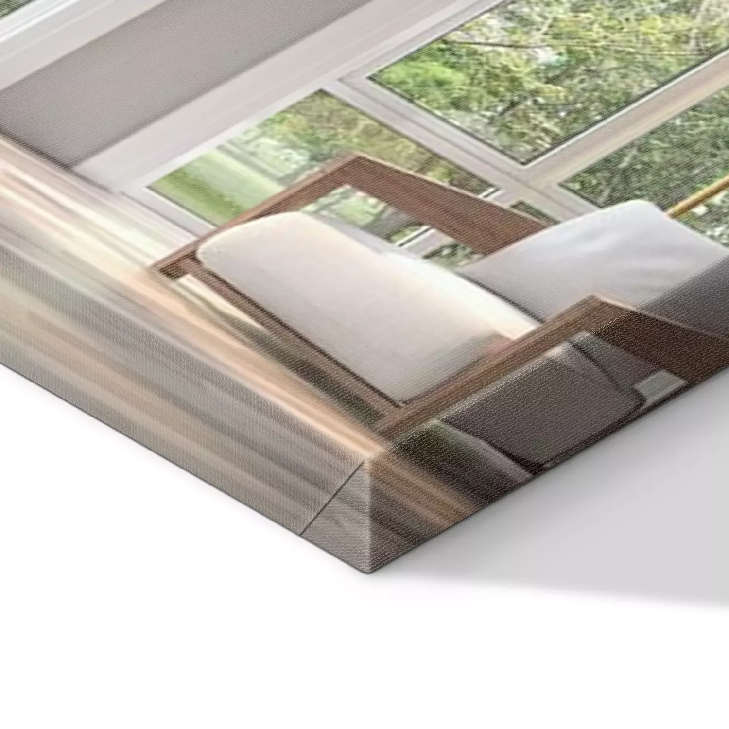 De print wordt aangebracht op hoogwaardig canvas dat op een schildersweefgetouw (spieraam) wordt gespannen. Omdat de print de zijranden bedekt, hoeft het ontwerp niet met een extra kader te worden omlijst. Wij raden ook composities aan die uit meerdere foto's bestaan en zo een coherente compositie vormen.