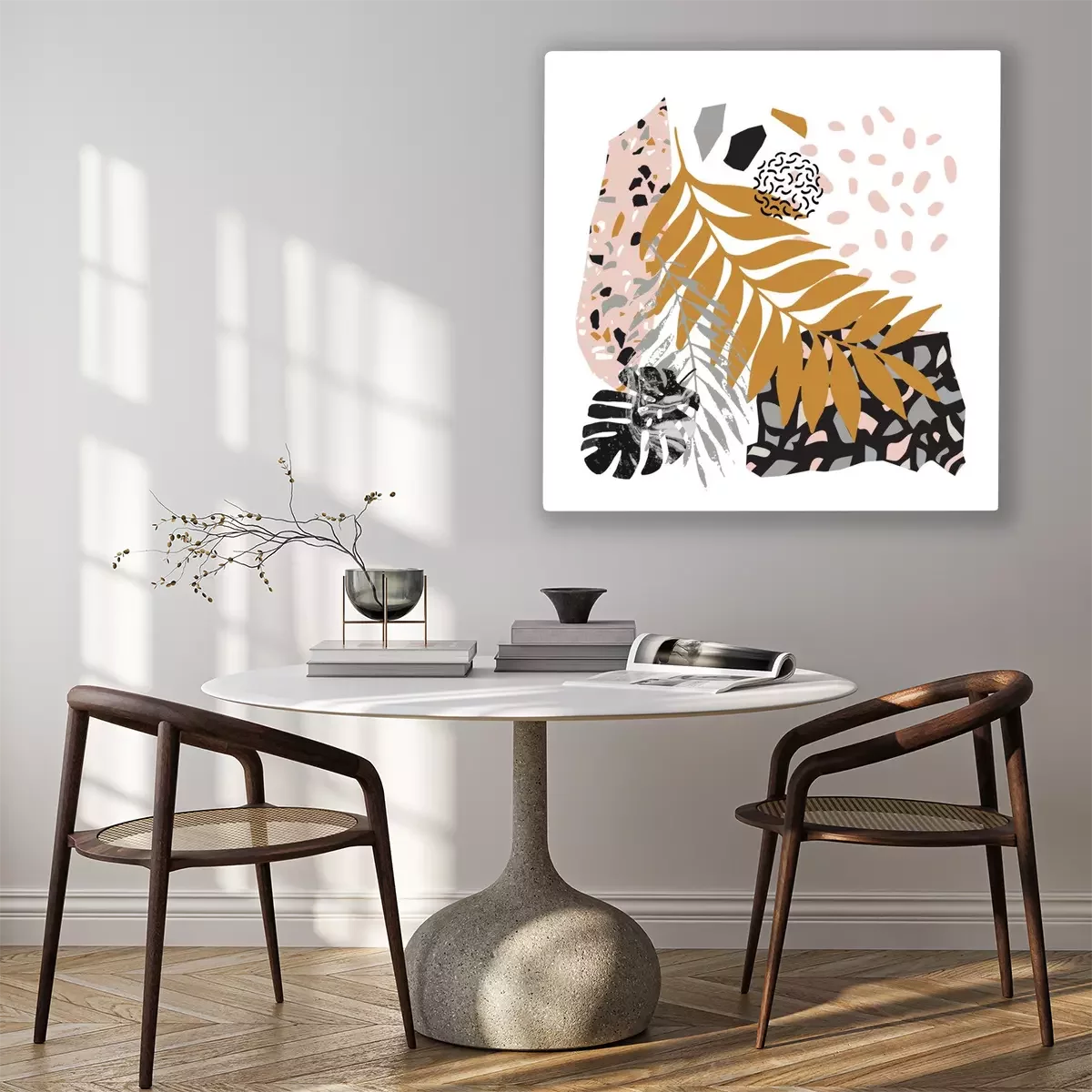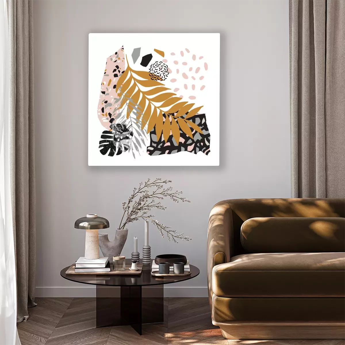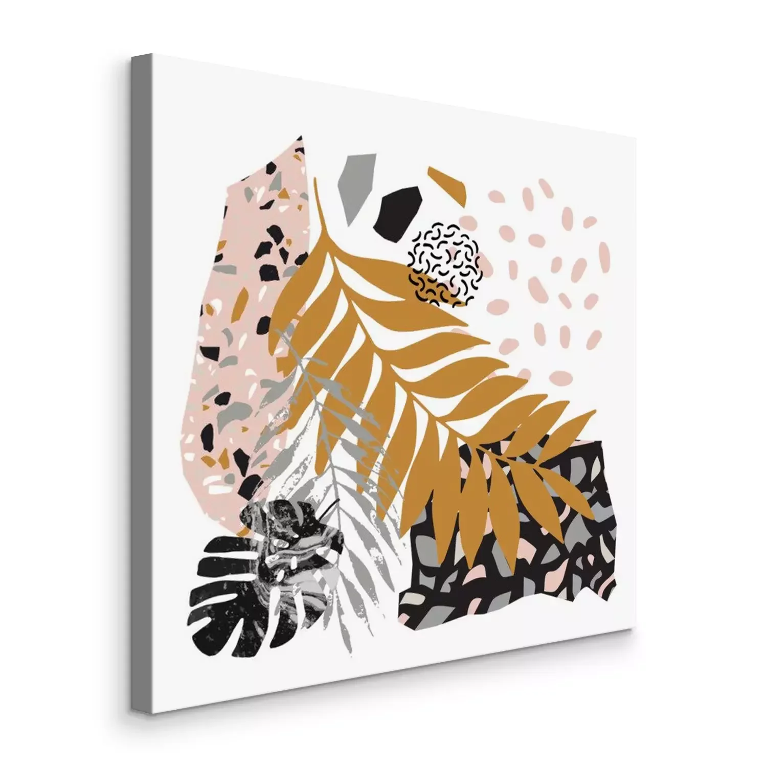Canvas Modern vector illustration with tropical leaves, grunge, marbling, terrazzo flooring textures, doodles, minimal elements.