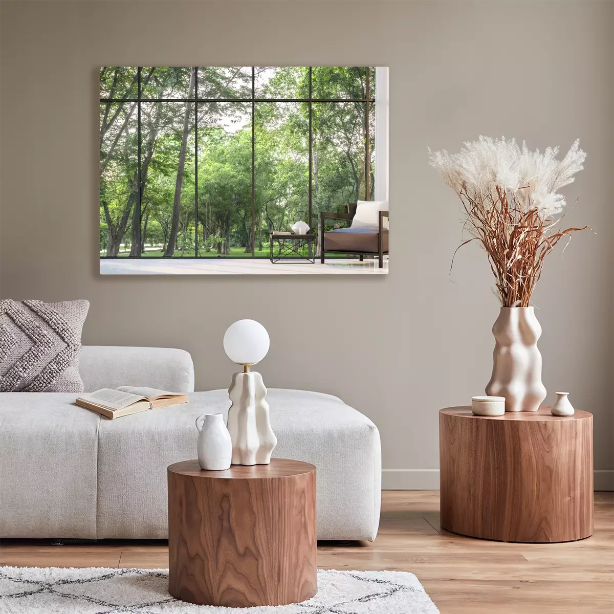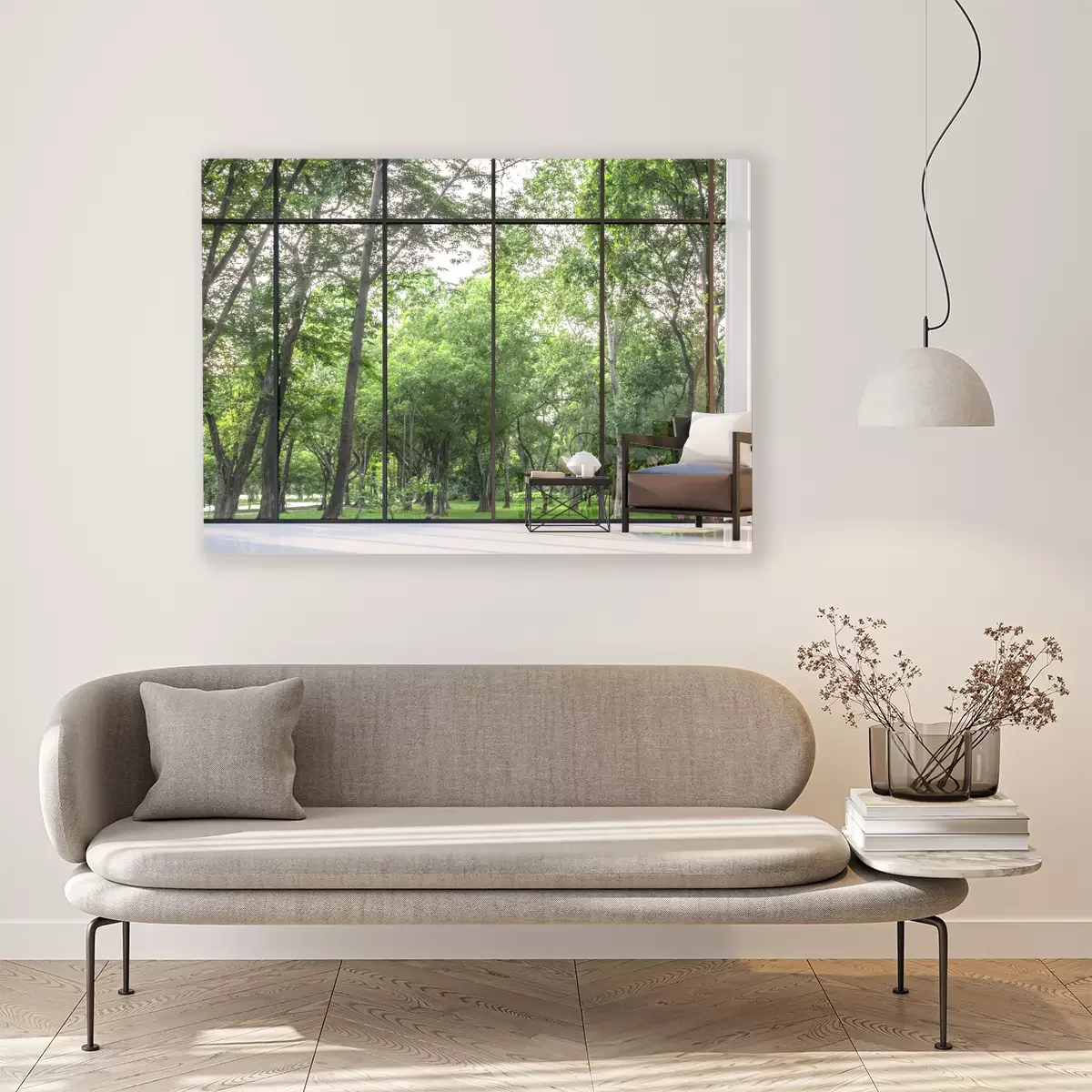 Canvas Moderne woonkamer met uitzicht op de tuin 3D-rendering Image.There zijn een groot raam met uitzicht op de omliggende tuin en de natuur